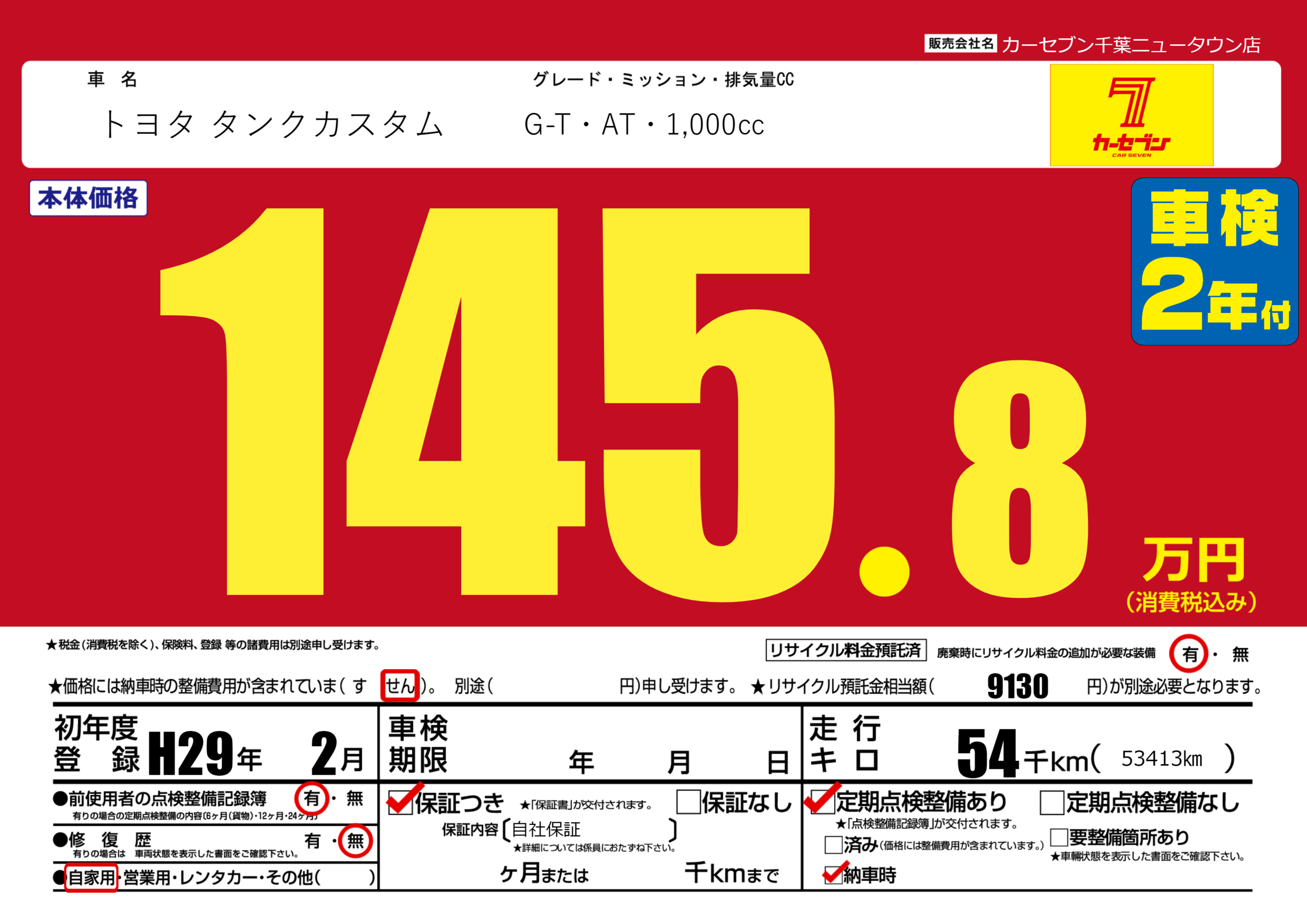 | 車名 | トヨタ タンクカスタム | グレード ミッション 排気量 |