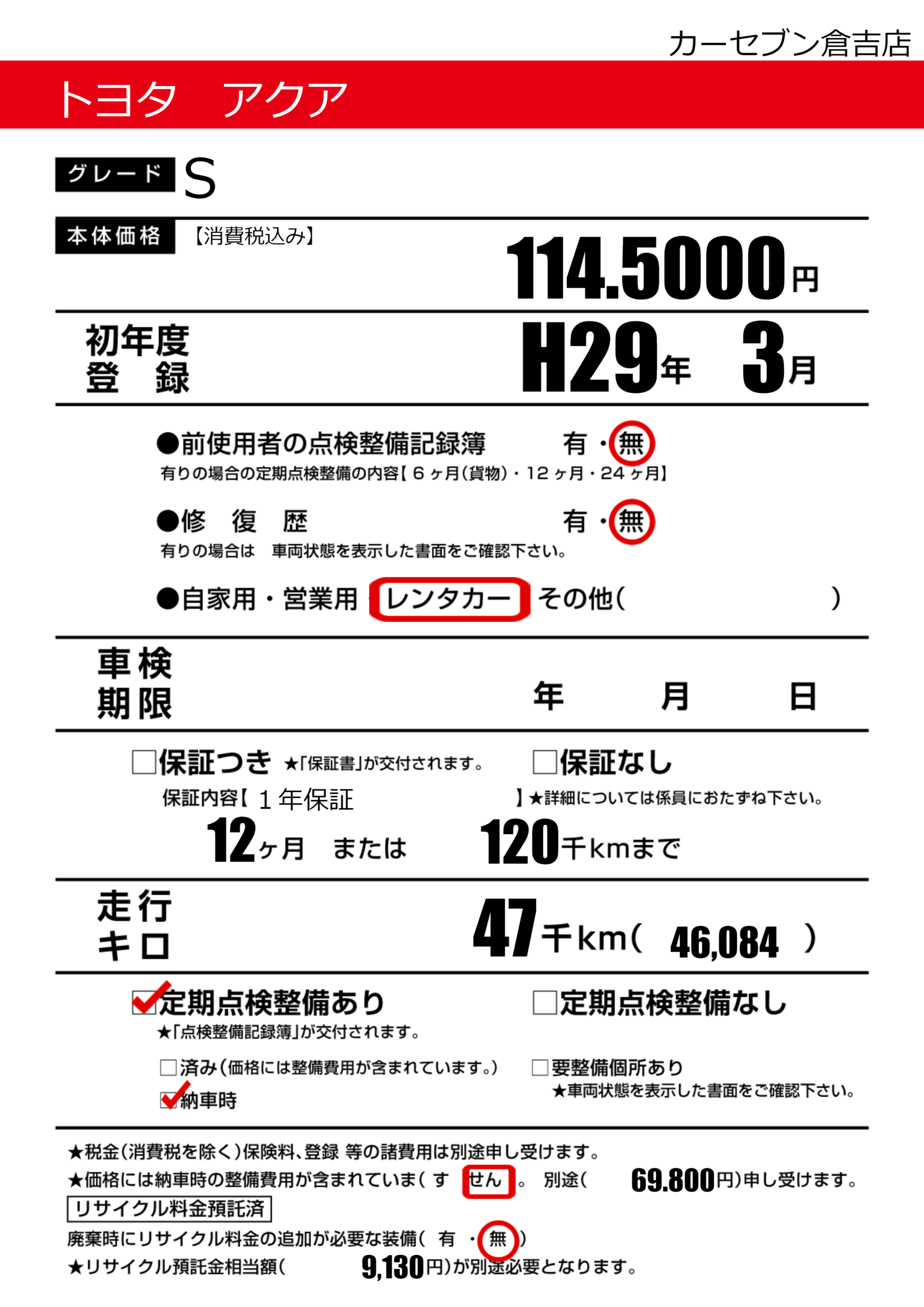 | 定期点検整備 | 定期点検整備あり 納車時あり | ||