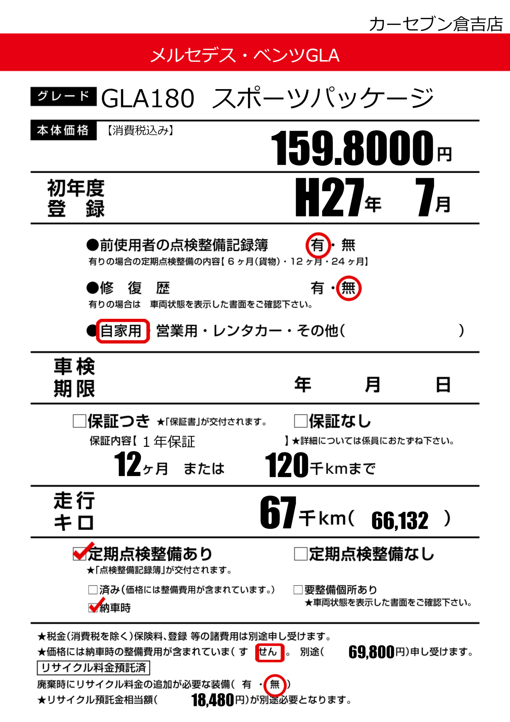 | 定期点検整備 | 定期点検整備あり 納車時あり | ||