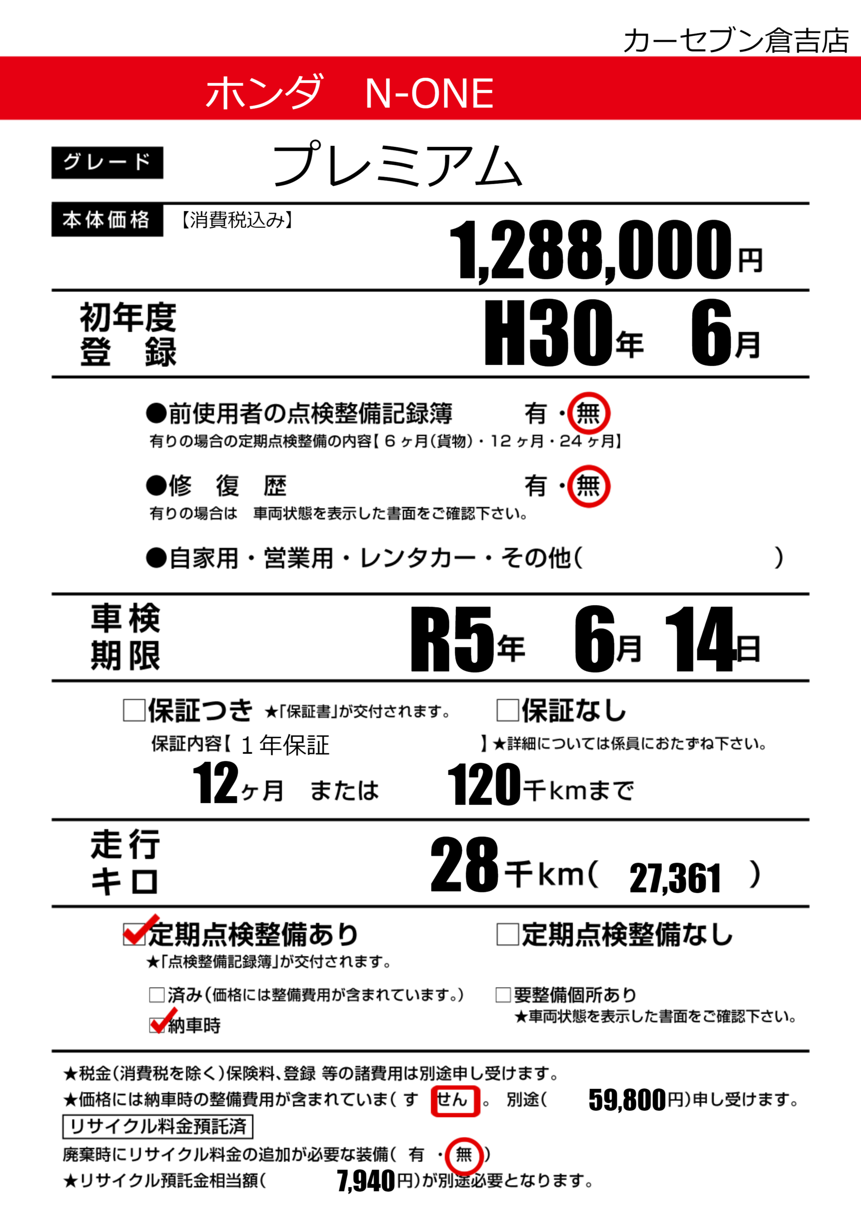 | 定期点検整備 | 定期点検整備あり 納車時あり | ||
