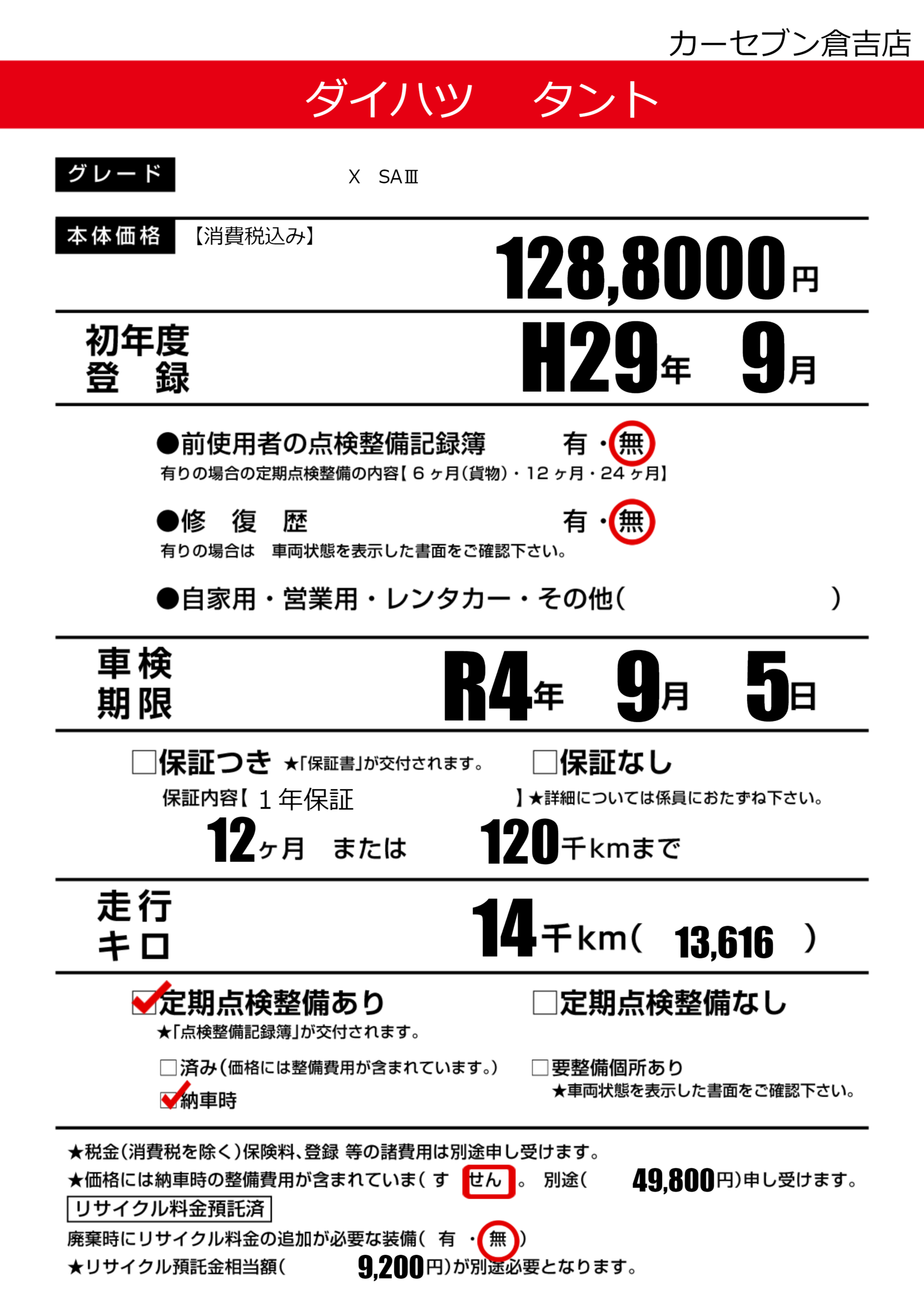 | 定期点検整備 | 定期点検整備あり 納車時あり | ||