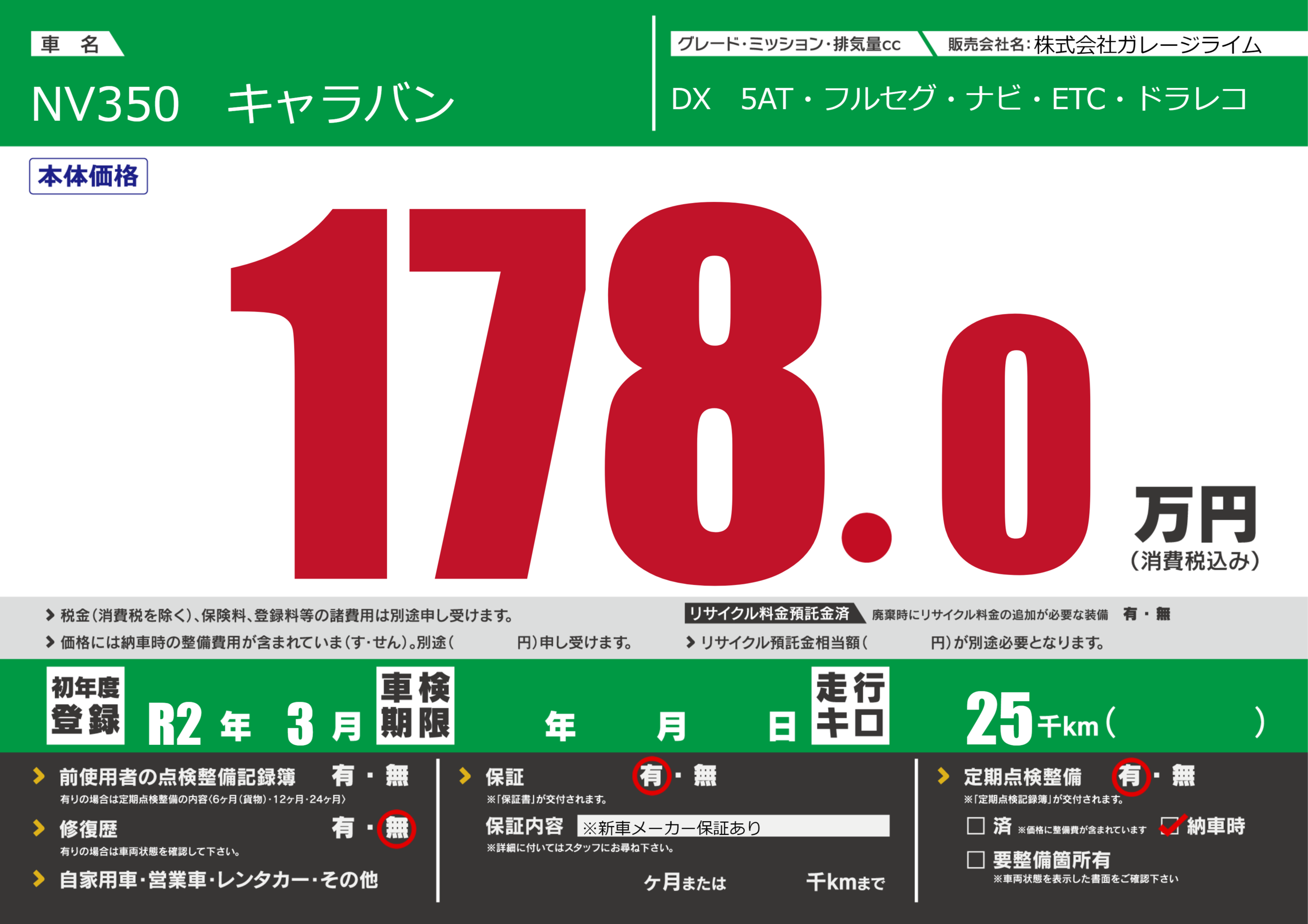 | 車名 | NV350 キャラバン | グレード ミッション 排気量 |