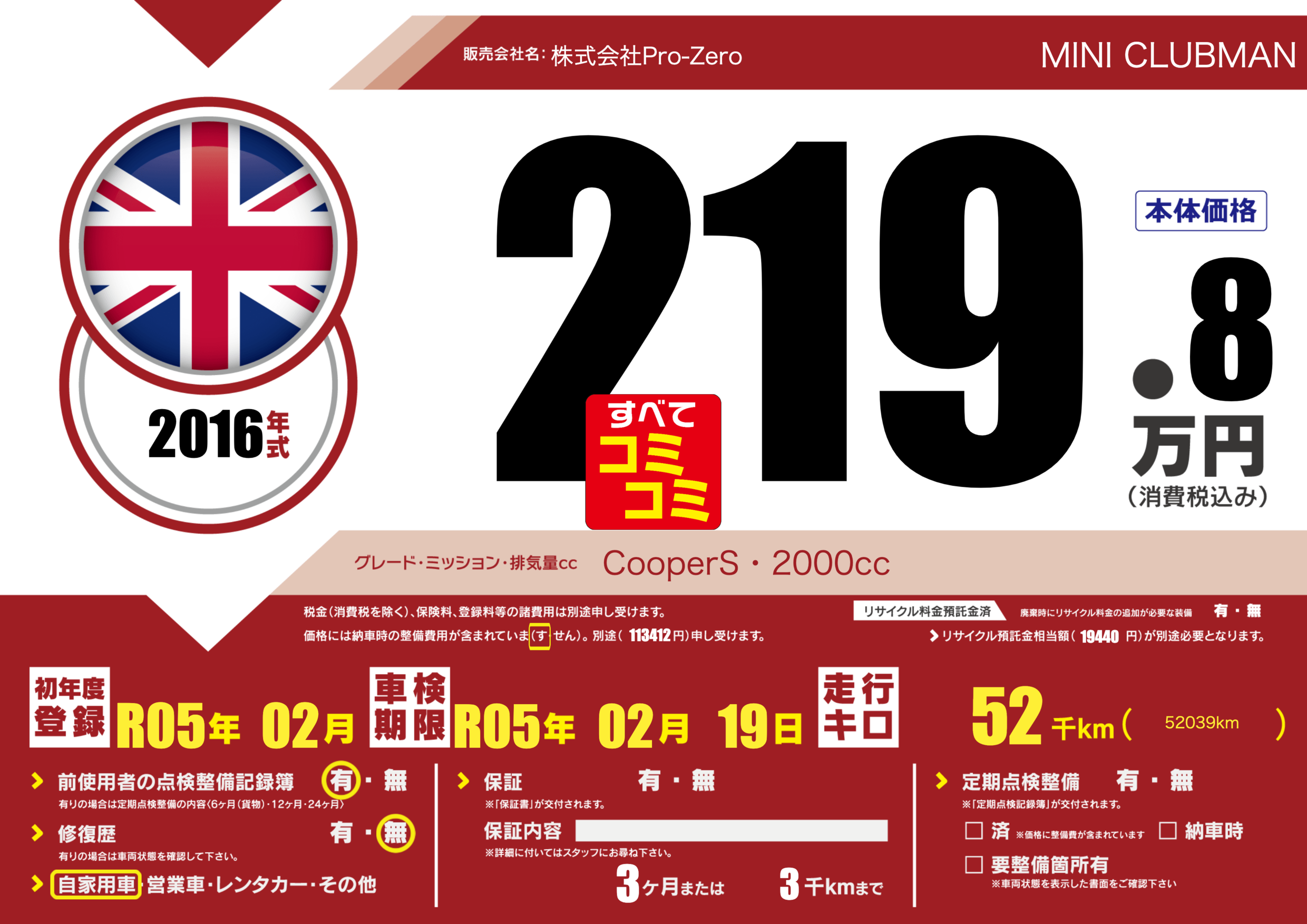 | 車検制限 | R05年 02月 19日 | ||
