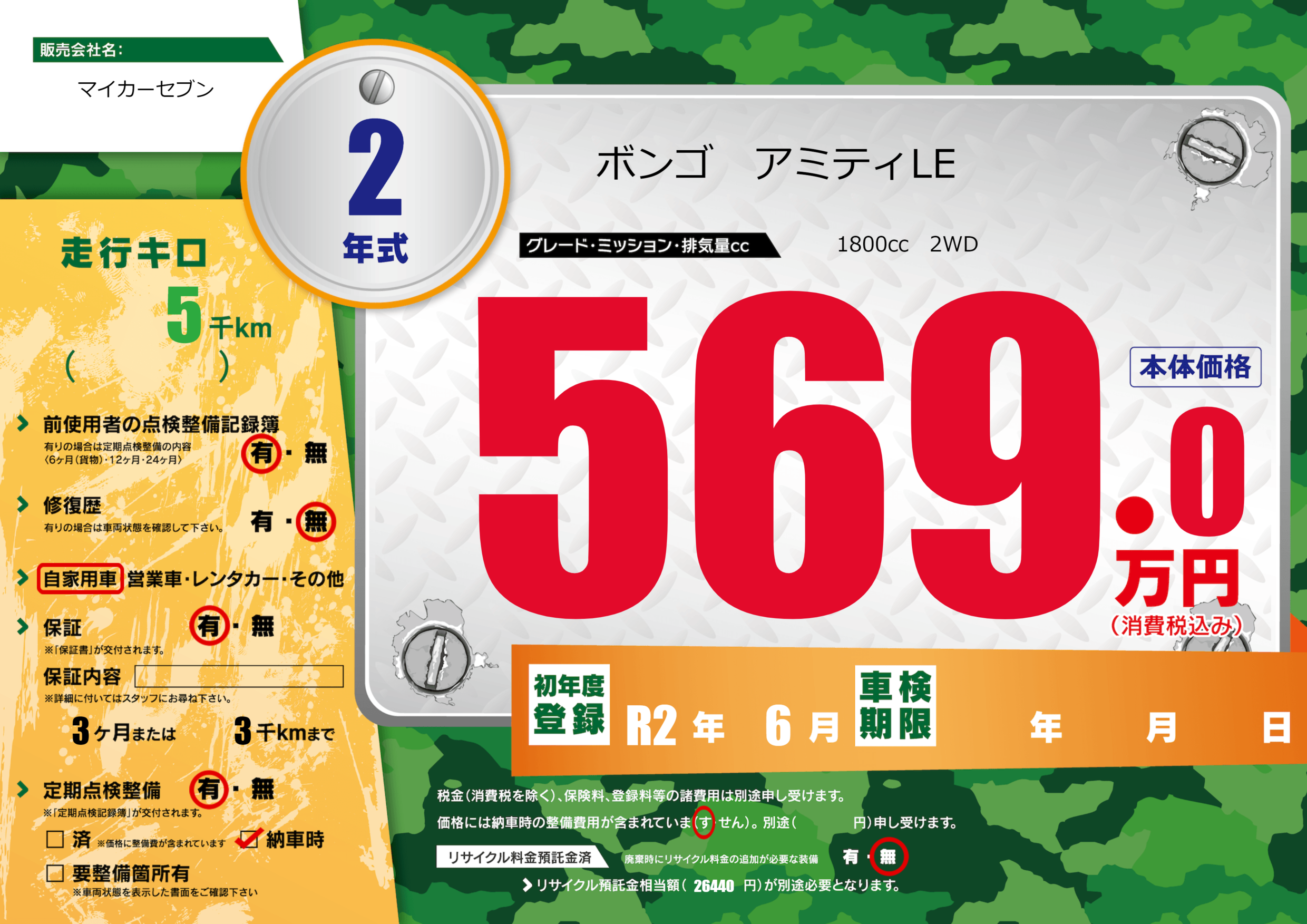 | 車名 | ボンゴ アミティLE | グレード ミッション 排気量 |