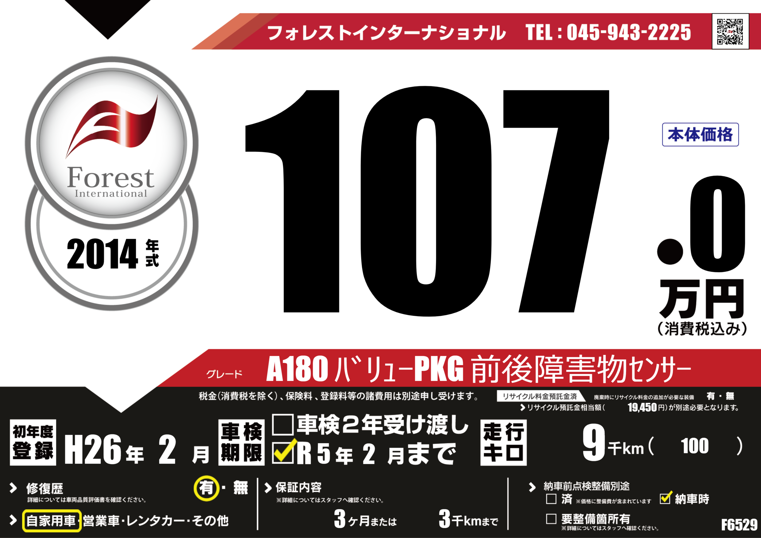 | 走行キロ | 0.9万km | 初年度登録 | H26年2月 |