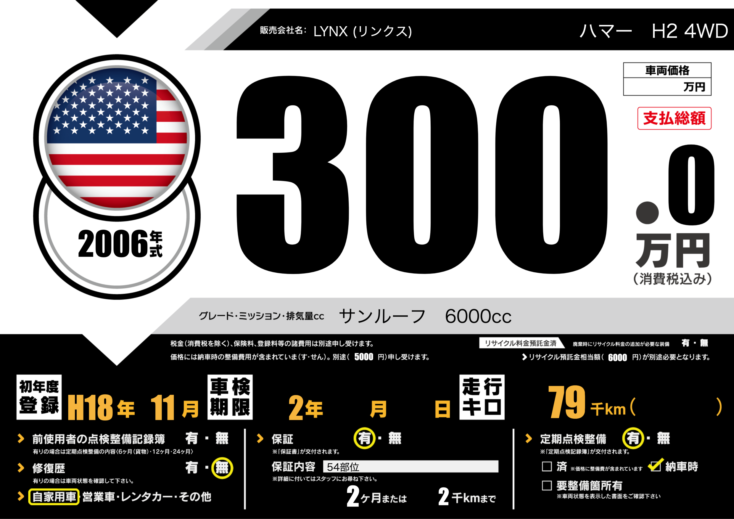 | 車名 | ハマー H2 4WD | グレード ミッション 排気量 |