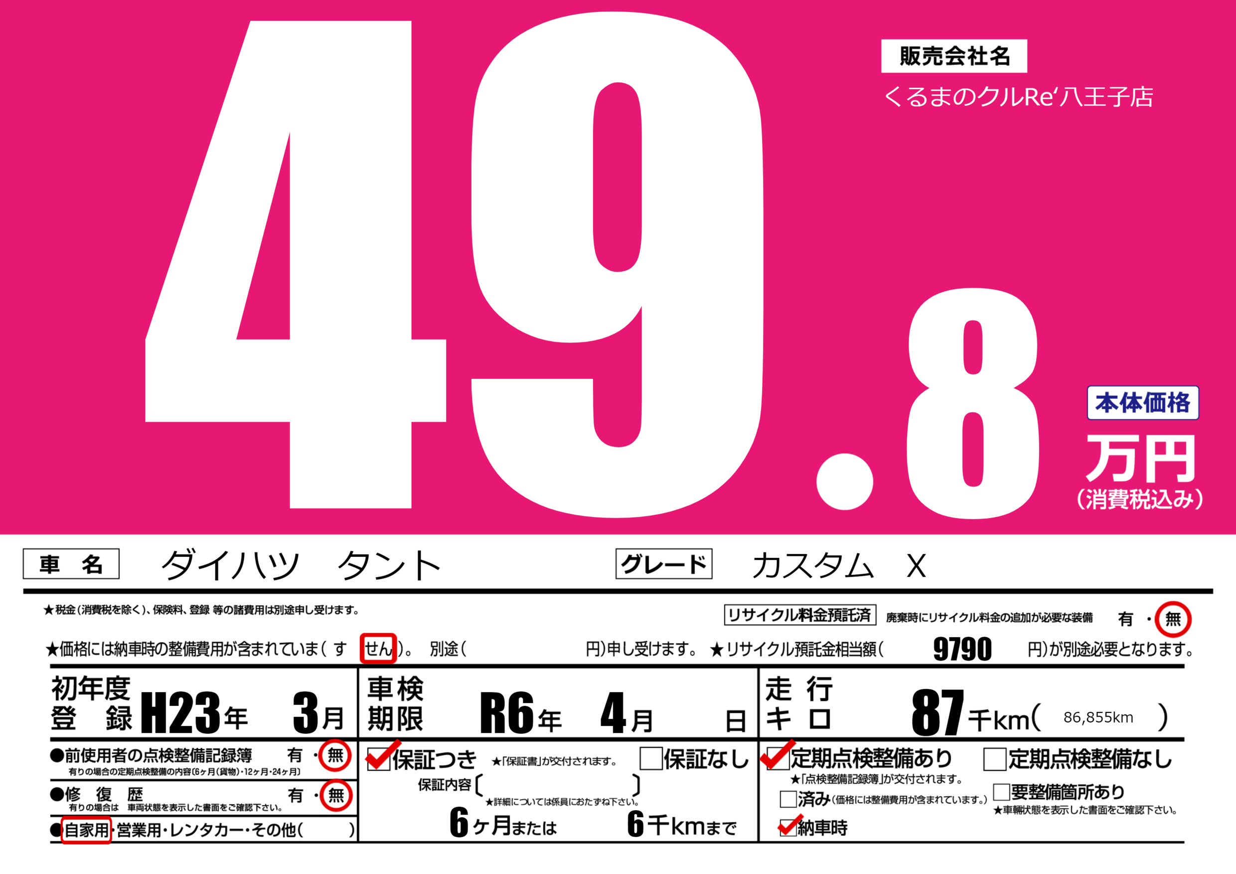 | 車名 | ダイハツ タント | グレード ミッション 排気量 |