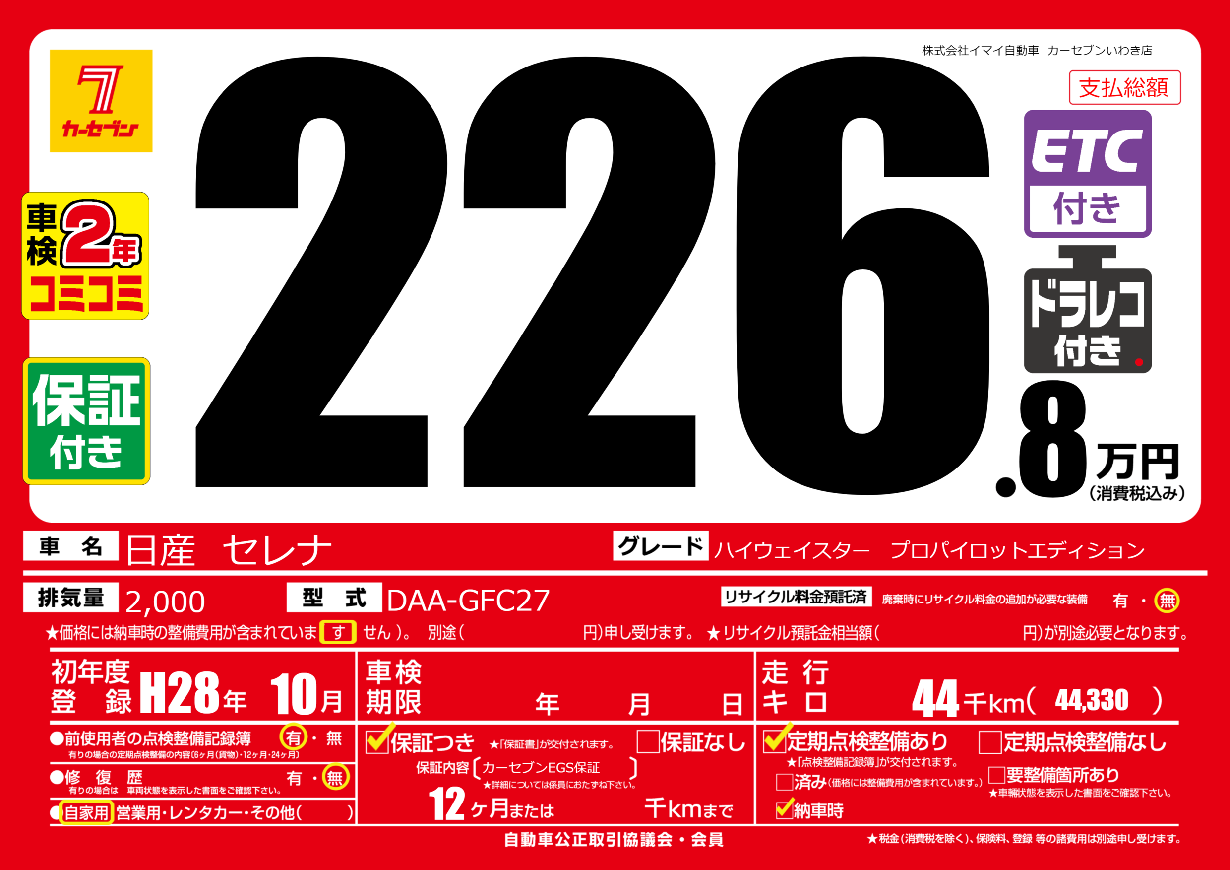 | 車名 | 日産 セレナ | グレード ミッション 排気量 |