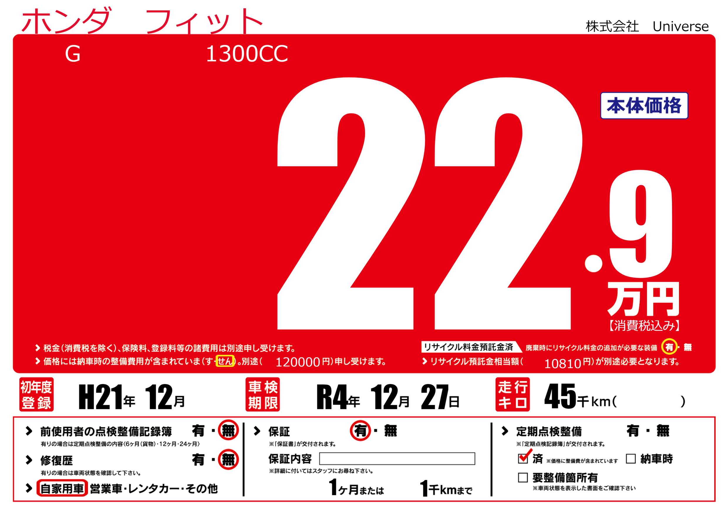 | 車名 | ホンダ フィット | グレード ミッション 排気量 |
