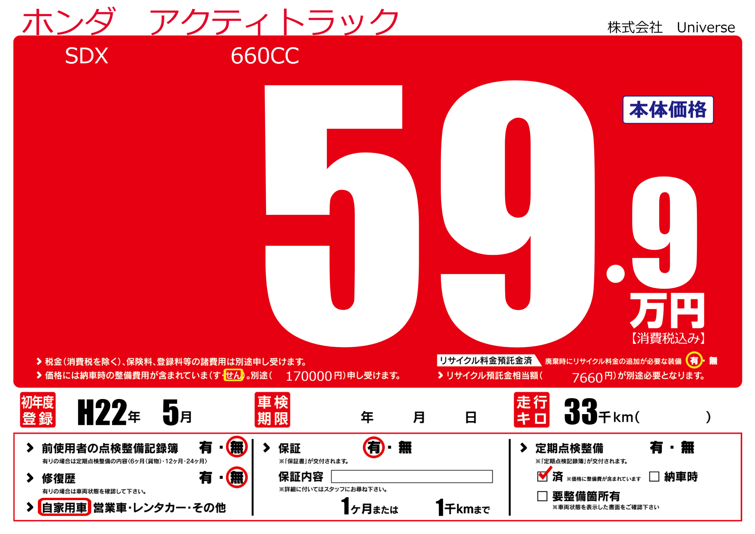 | 走行キロ | 3.3万km | 初年度登録 | H22年5月 |
