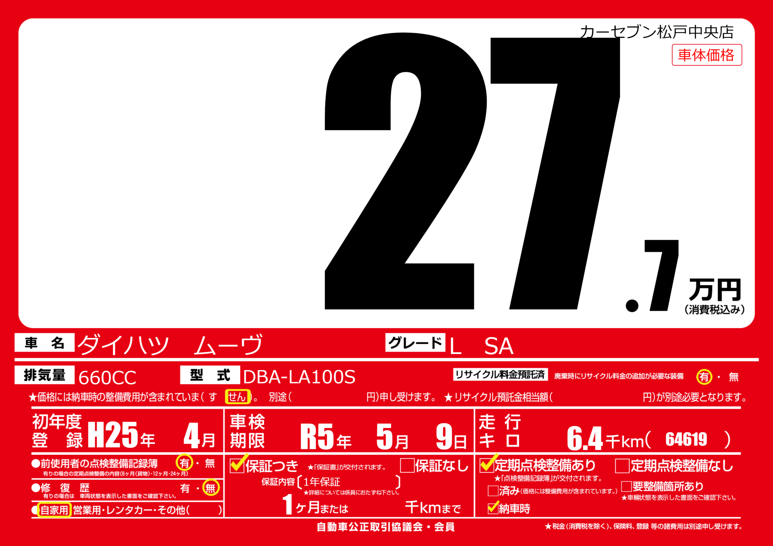 | 車名 | ダイハツ ムーヴ | グレード ミッション 排気量 |