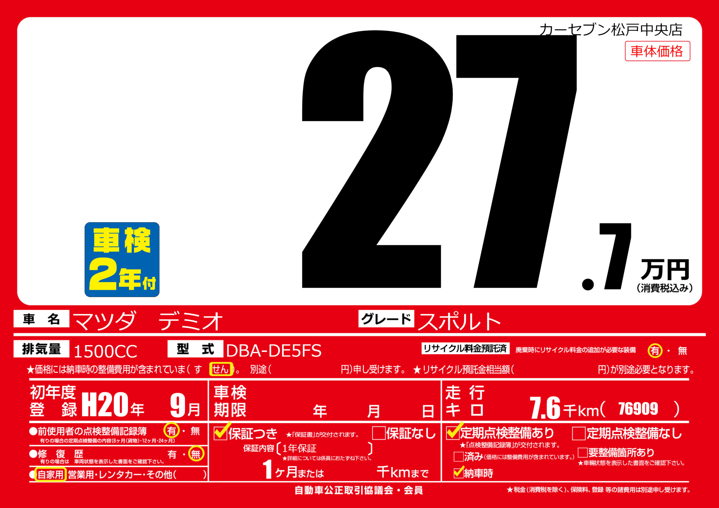 | 車名 | マツダ デミオ | グレード ミッション 排気量 |