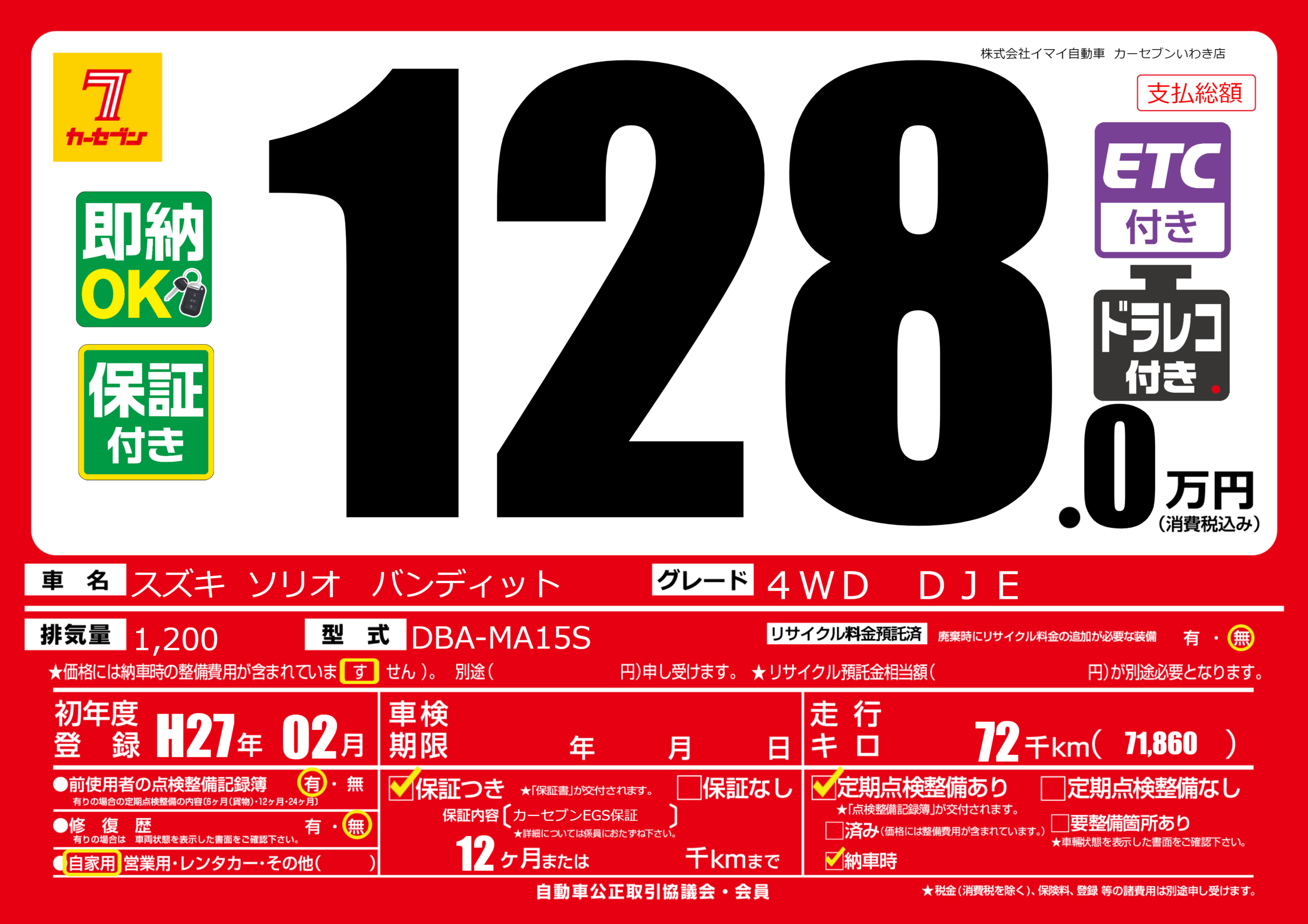 | 車名 | スズキ ソリオ バンディット | グレード ミッション 排気量 |