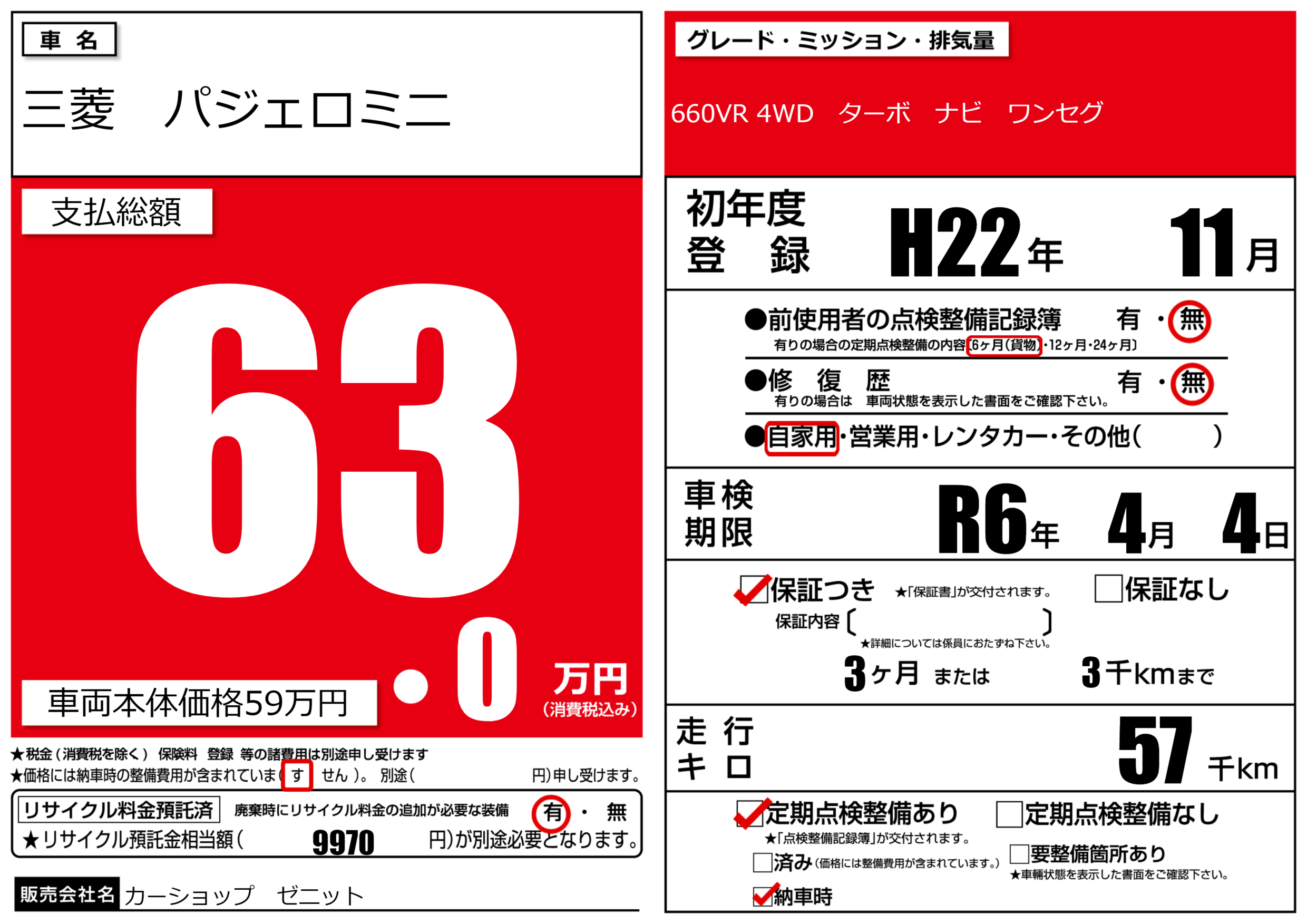 | 車名 | 三菱 パジェロミニ | グレード ミッション 排気量 |