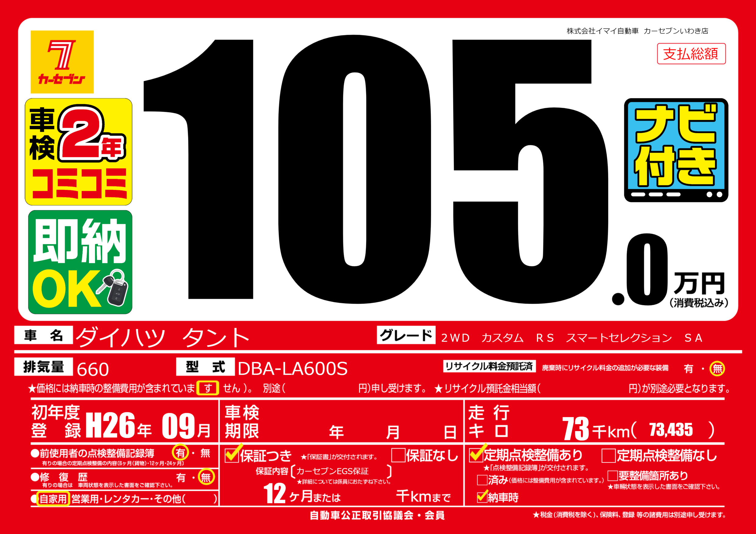 | 走行キロ | 7.3万km | 初年度登録 | H26年09月 |