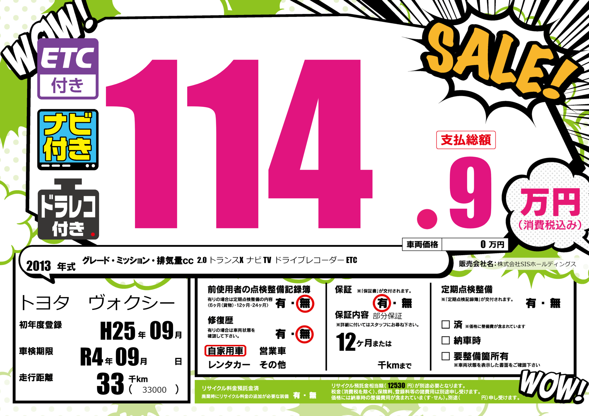 | 走行キロ | 3.3万km | 初年度登録 | H25年09月 |
