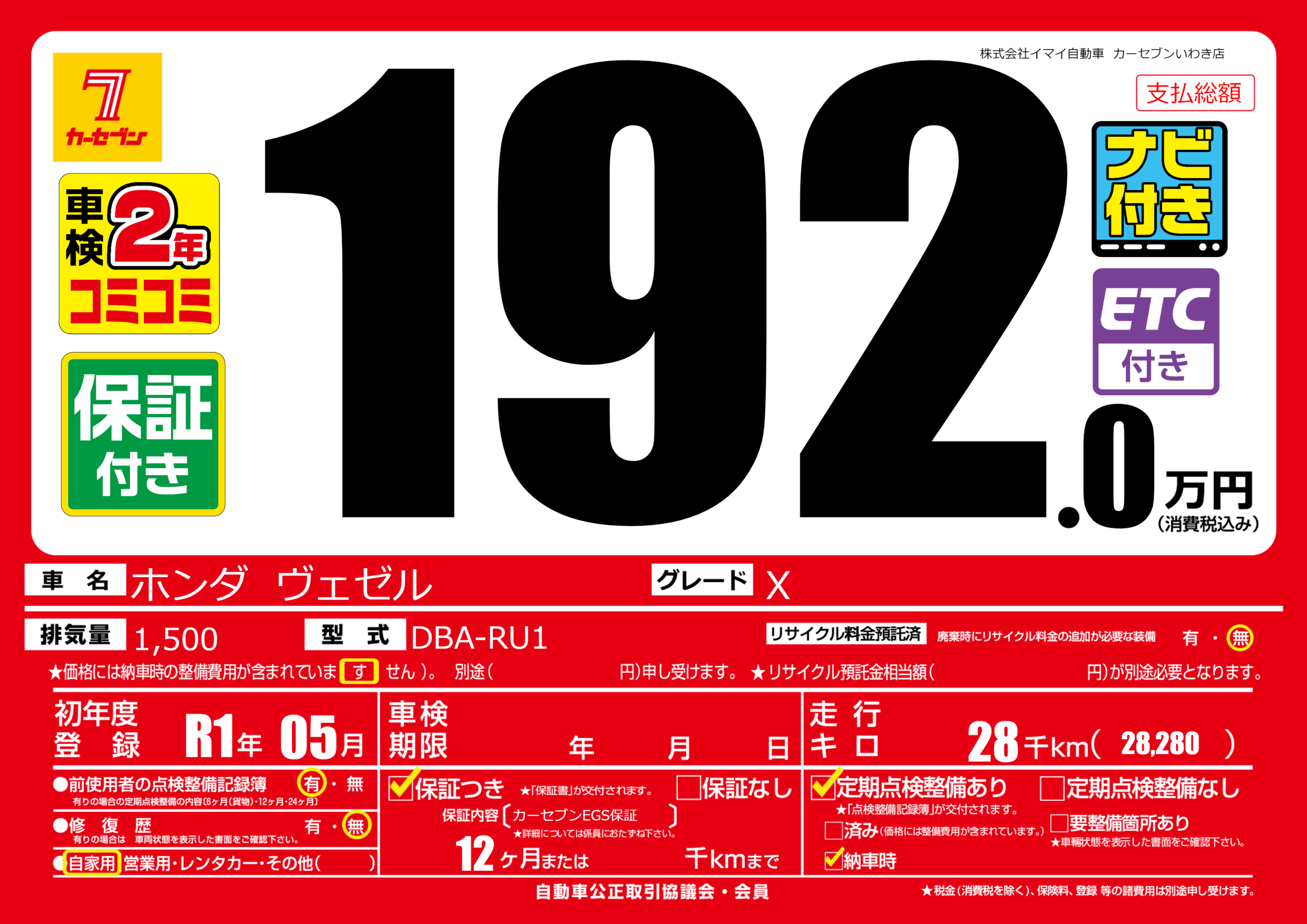 | 車名 | ホンダ ヴェゼル | グレード ミッション 排気量 |