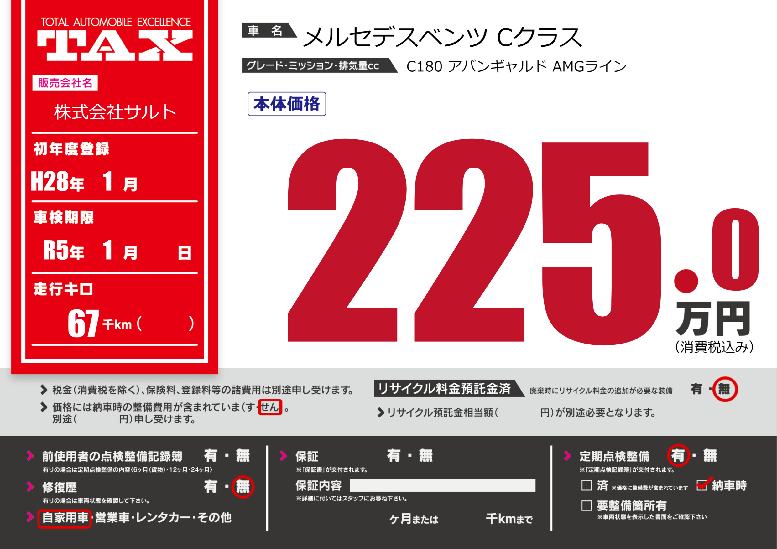 | 車名 | メルセデスベンツ Cクラス | グレード ミッション 排気量 |