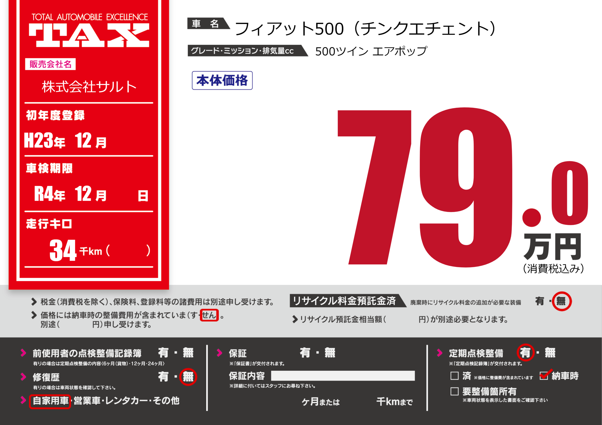| 車名 | フィアット500(チンクエチェント) | グレード ミッション 排気量 |