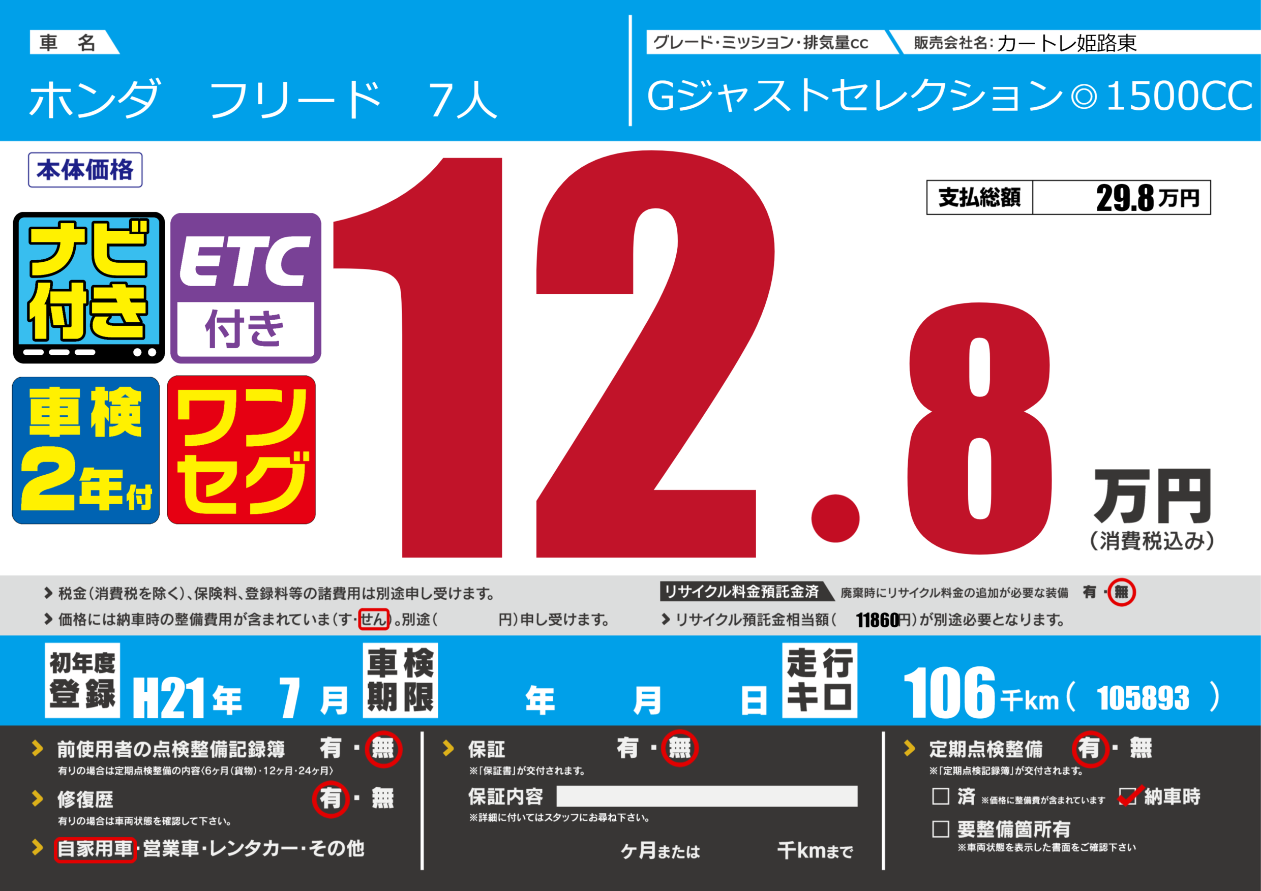 | 定期点検整備 | 定期点検整備あり 納車時あり | ||