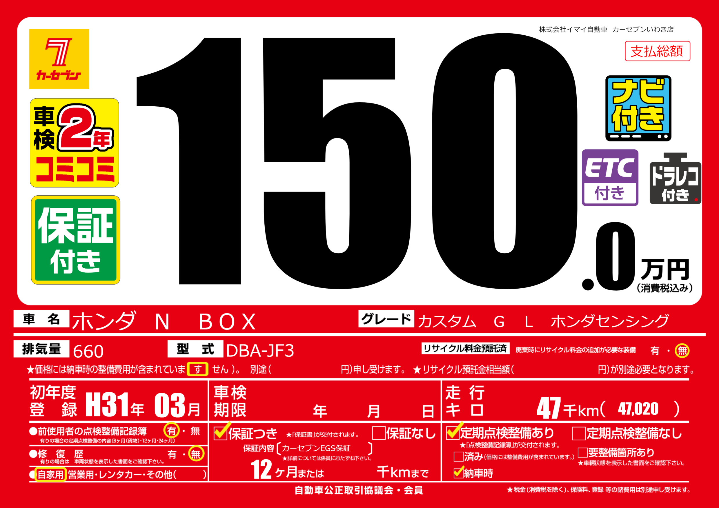 保証付き 保証内容(カーセブンEGS保証) 12ヶ月または千km |