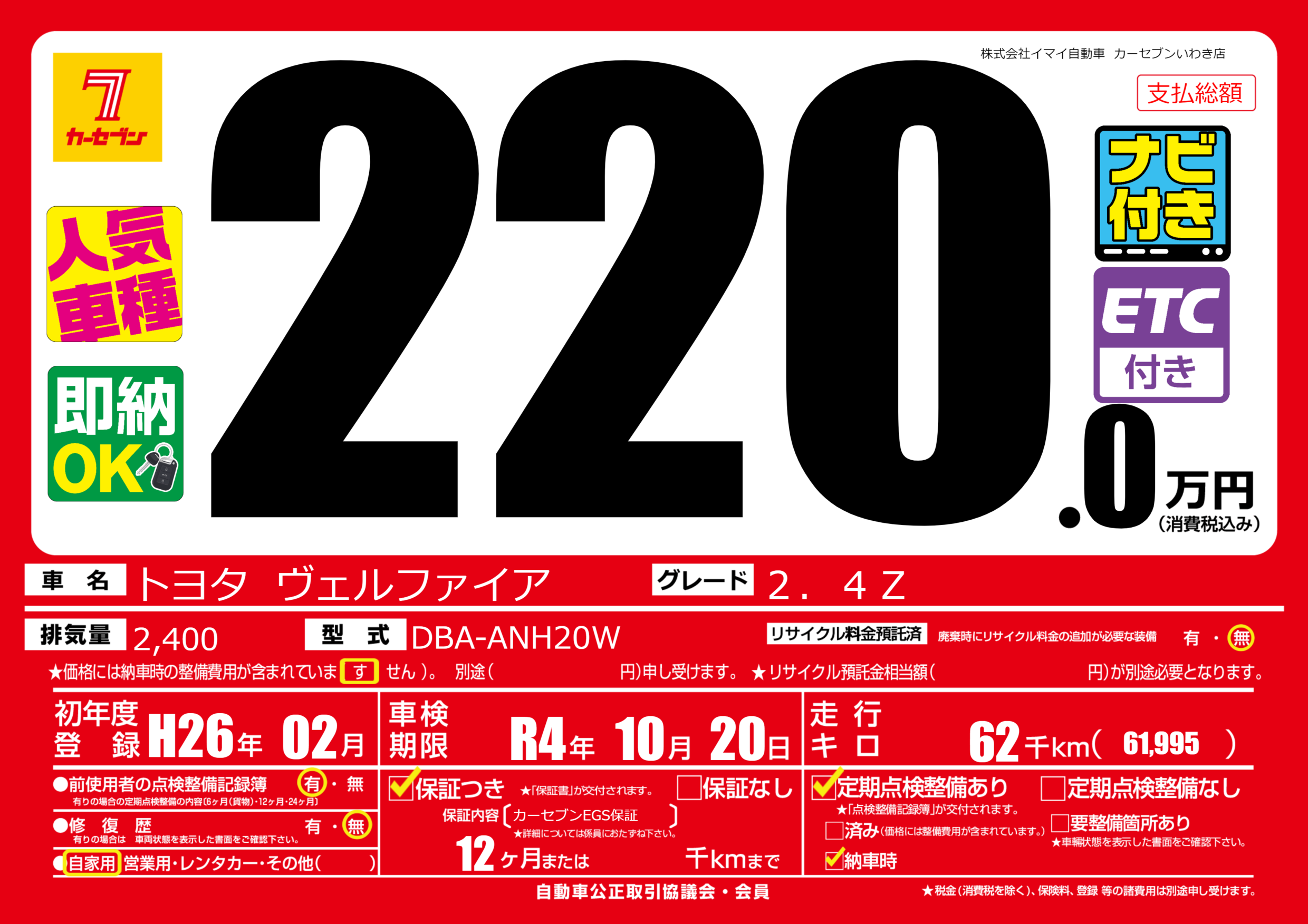 | 車名 | トヨタ ヴェルファイア | グレード ミッション 排気量 |