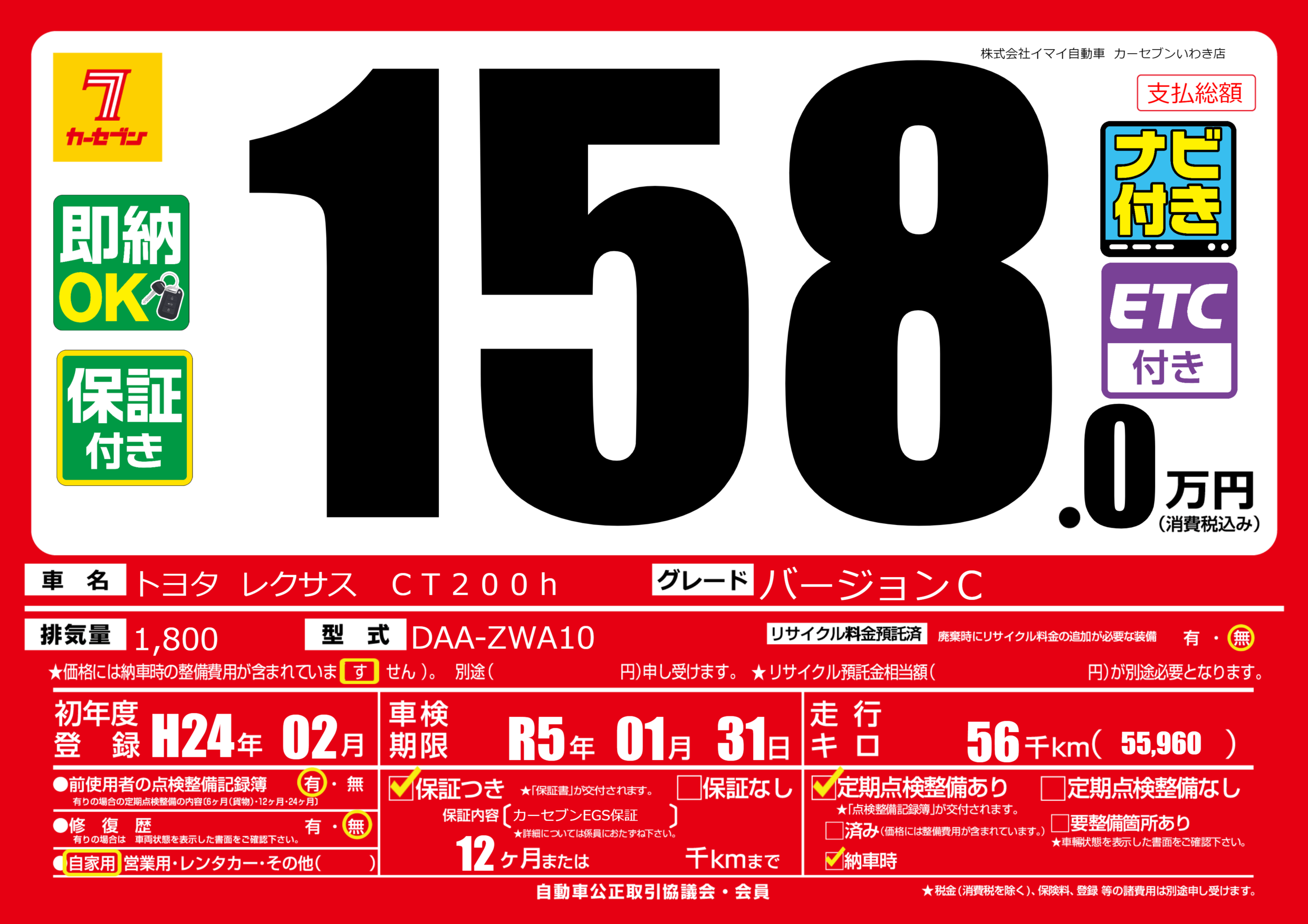 | 車名 | トヨタ レクサス CT200h | グレード ミッション 排気量 |