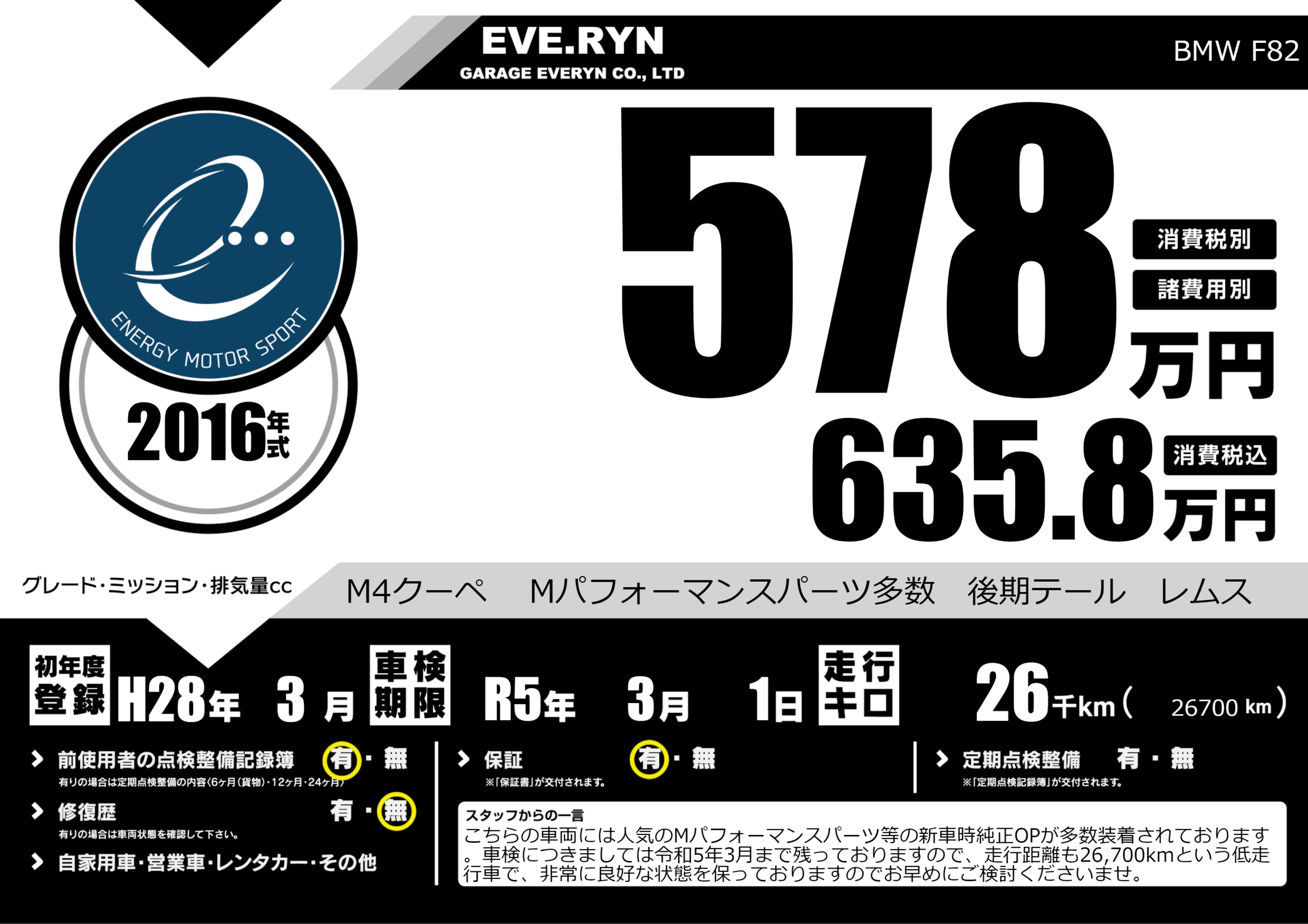 | 車名 | BMW F82 | グレード ミッション 排気量 |