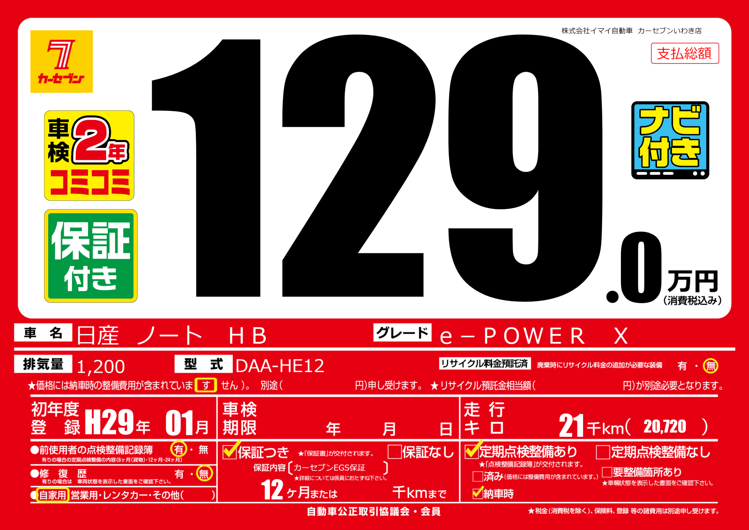 | 車名 | 日産 ノート HB | グレード ミッション 排気量 |