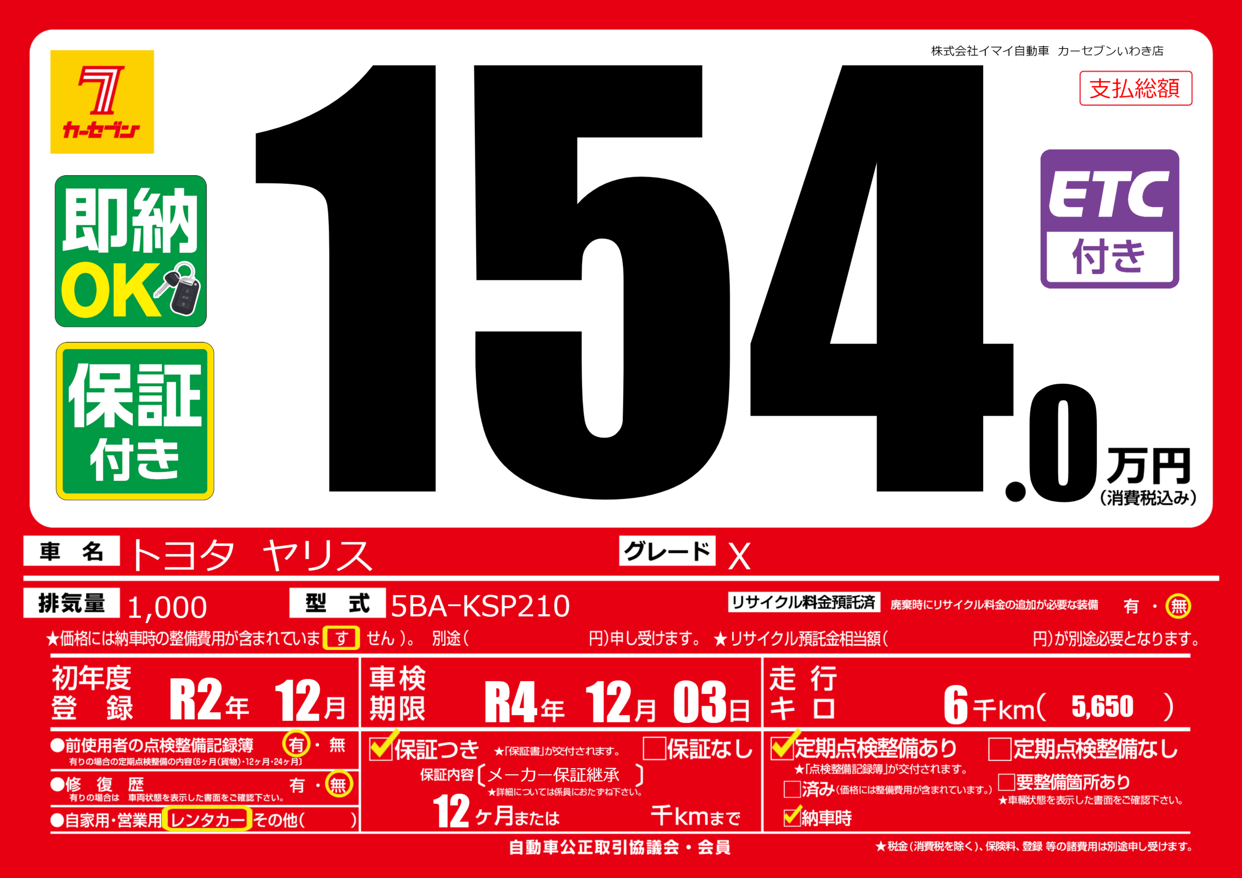 | 走行キロ | 0.6万km | 初年度登録 | R2年12月 |