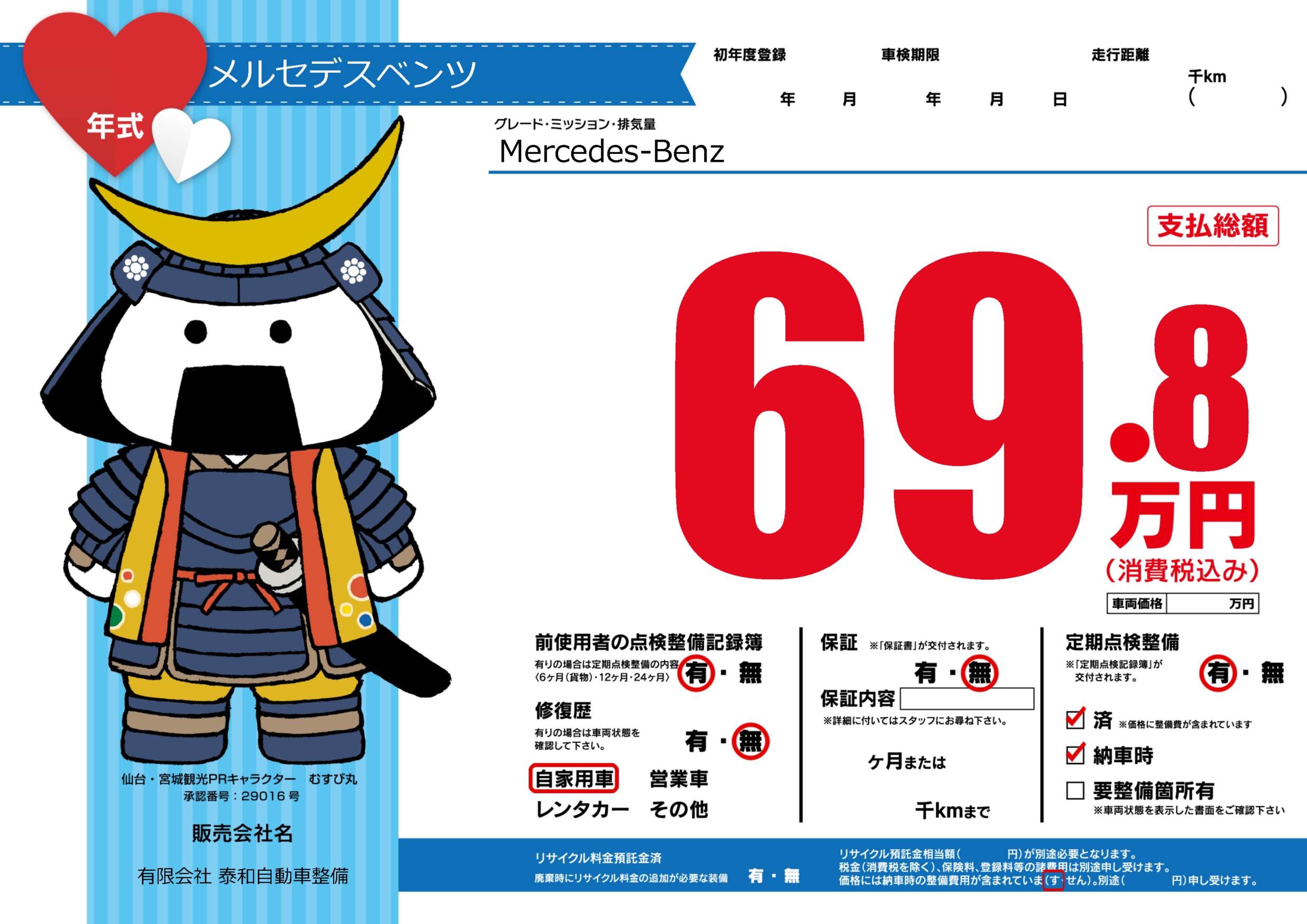 | 定期点検整備 | 定期点検整備あり 定期点検整備済み 納車時あり | ||