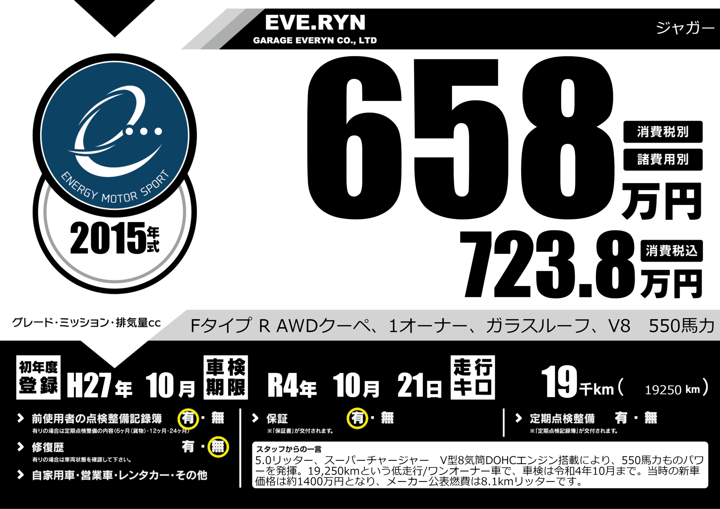 Fタイプ R AWDクーペ、1オーナー、ガラスルーフ、V8 550馬力 |