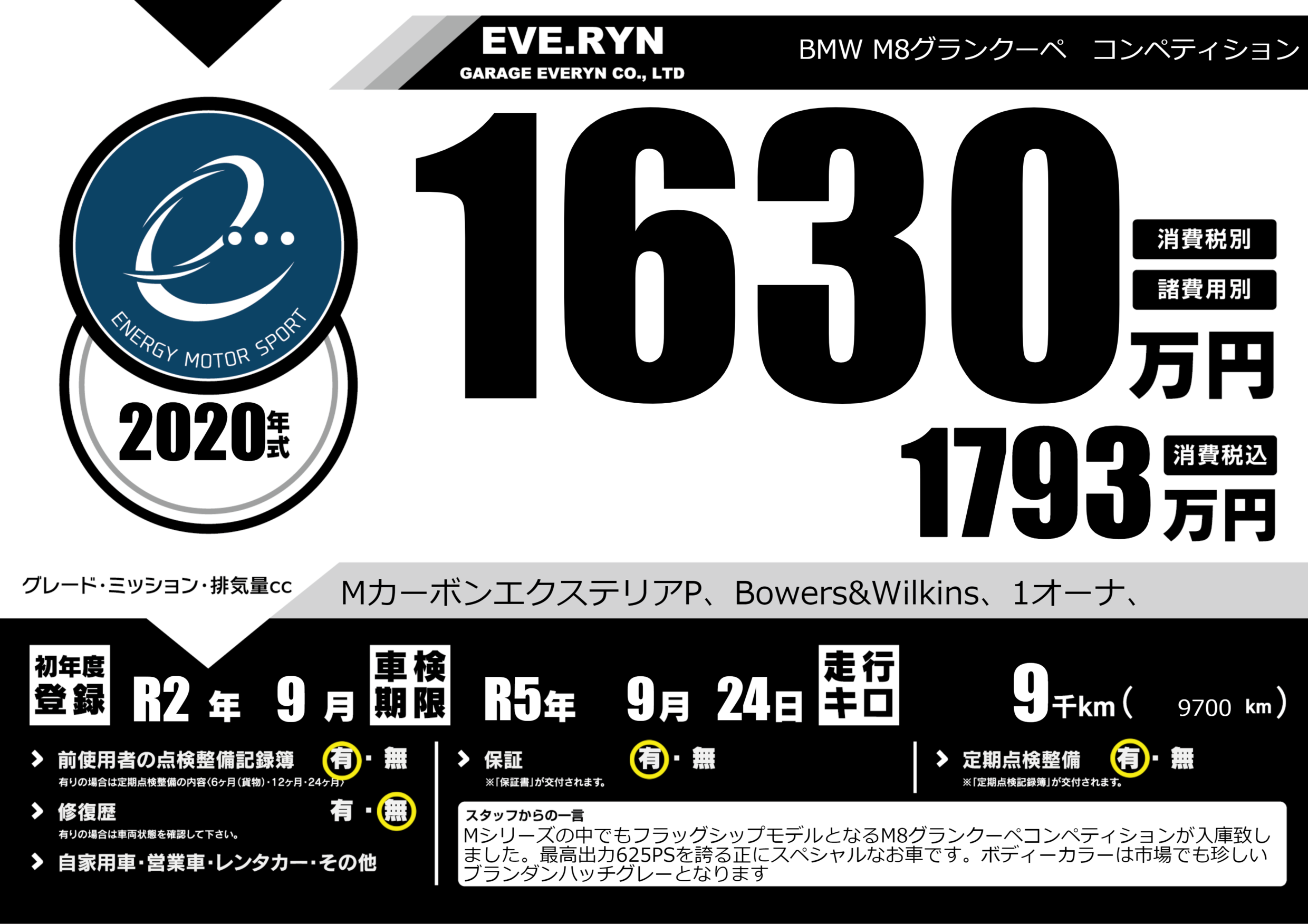 | 車名 | BMW M8グランクーペ コンペティション | グレード ミッション 排気量 |