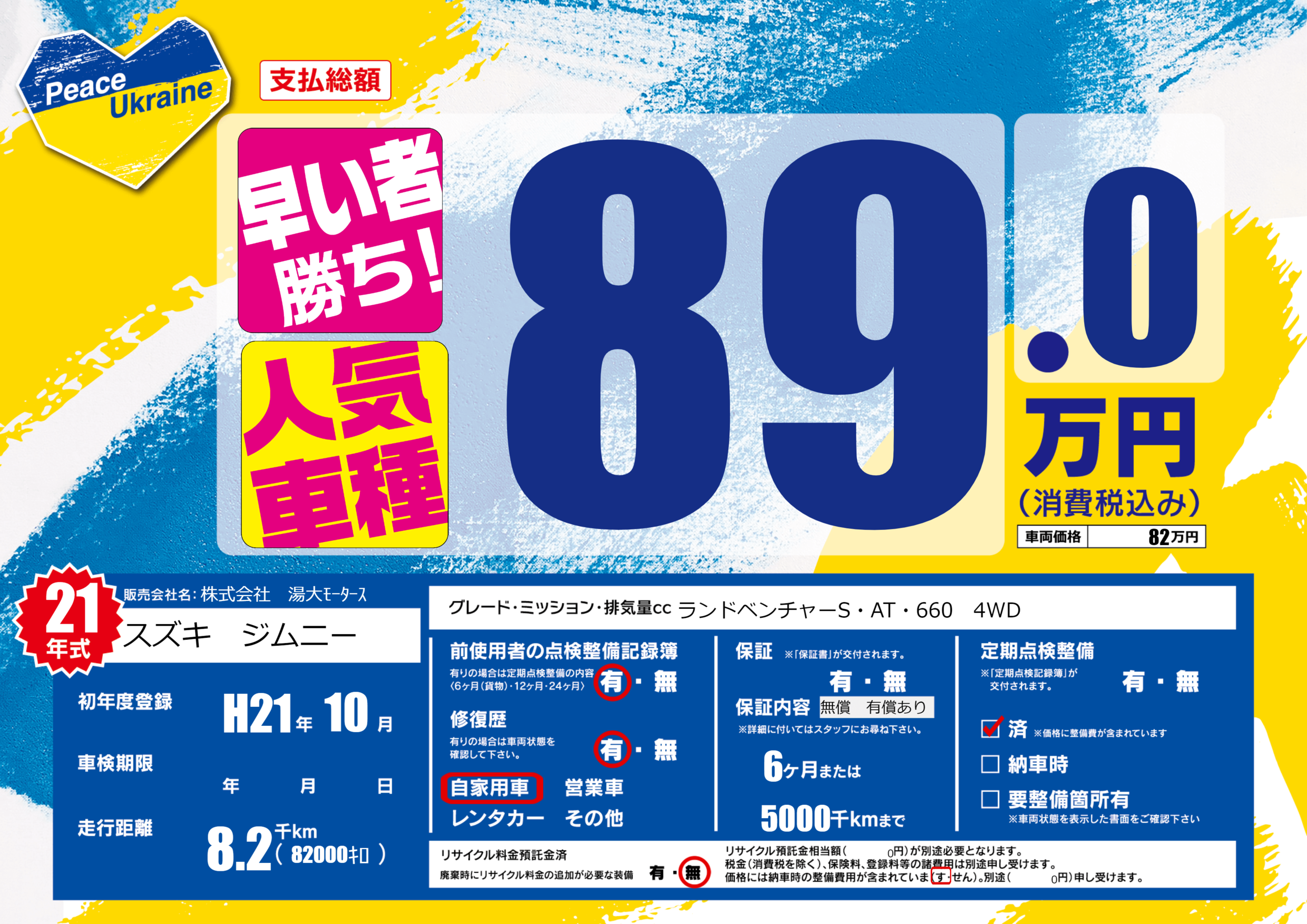 | 走行キロ | 0.8万km | 初年度登録 | H21年10月 |