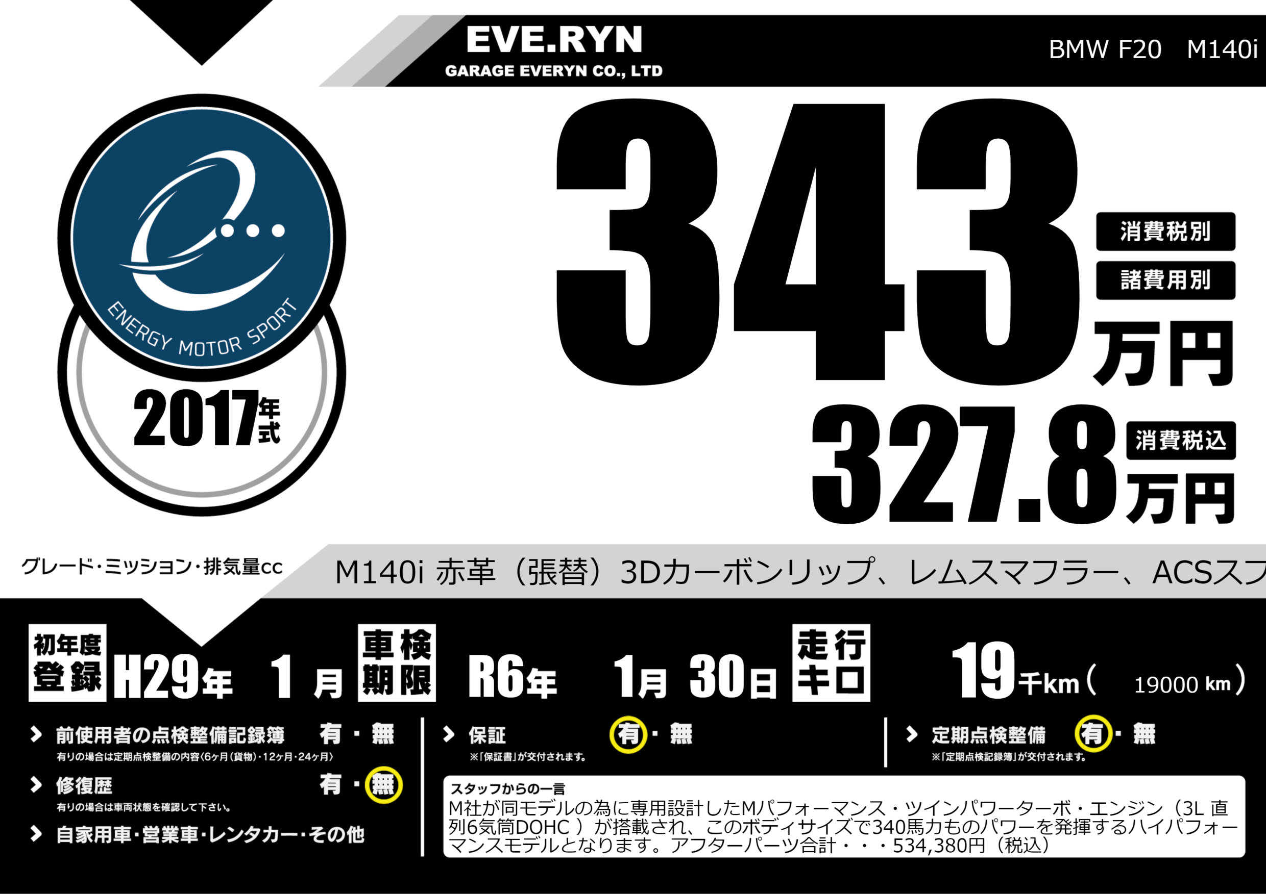 | 車名 | BMW F20 M140i | グレード ミッション 排気量 |