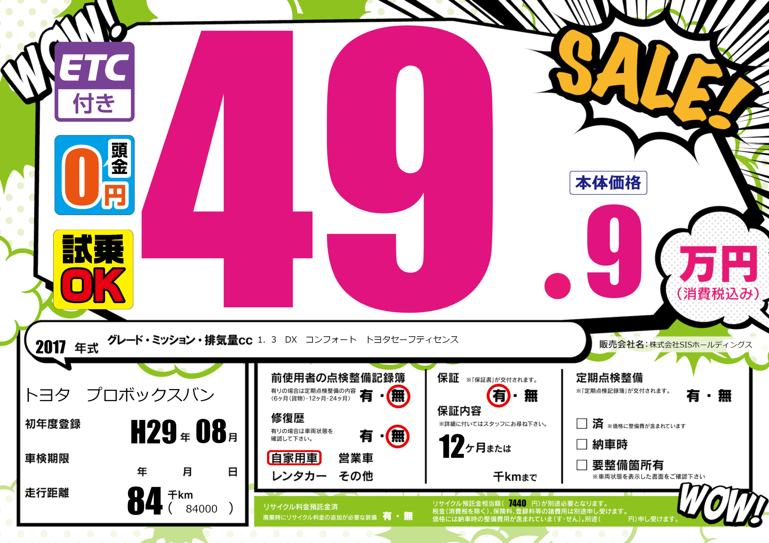 | 車名 | トヨタ プロボックスバン | グレード ミッション 排気量 |