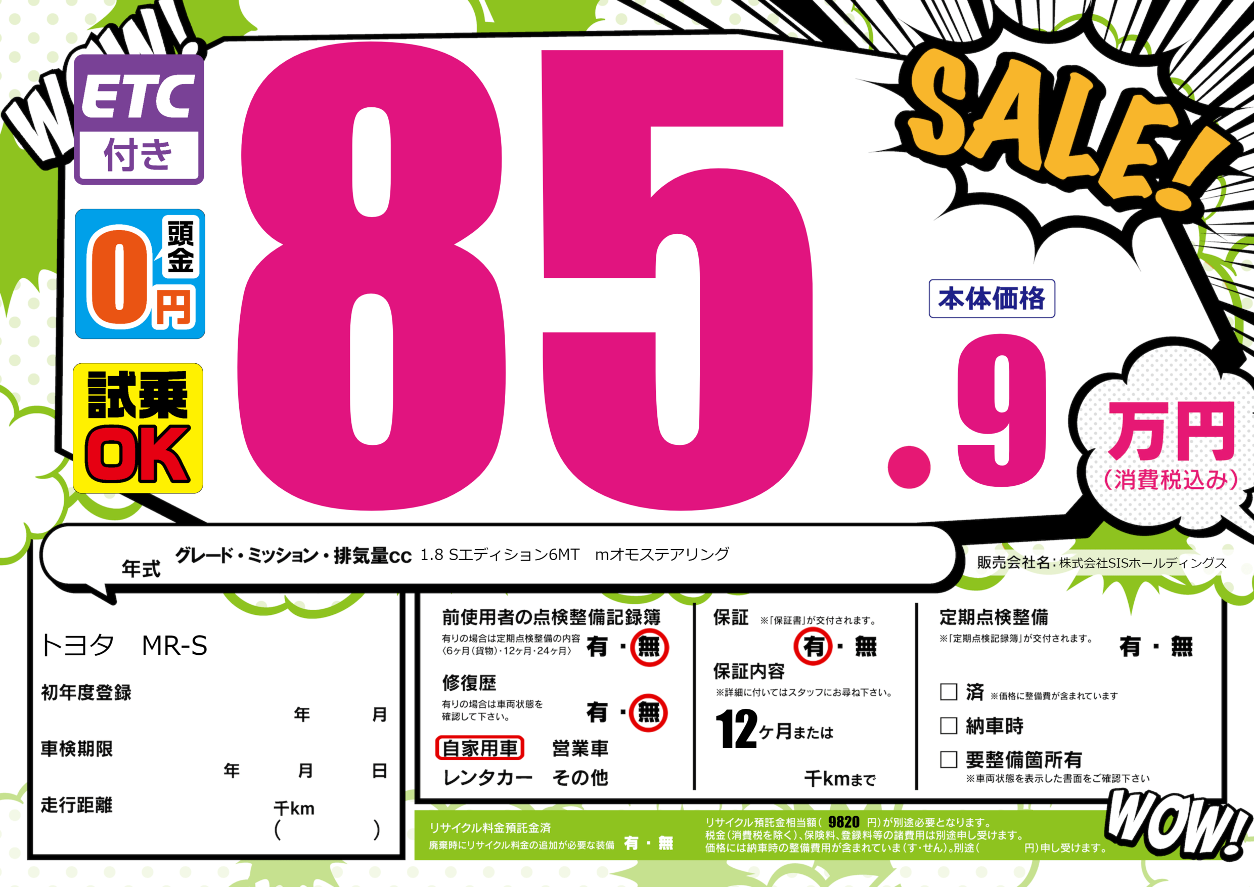 | 車名 | トヨタ MR-S | グレード ミッション 排気量 |