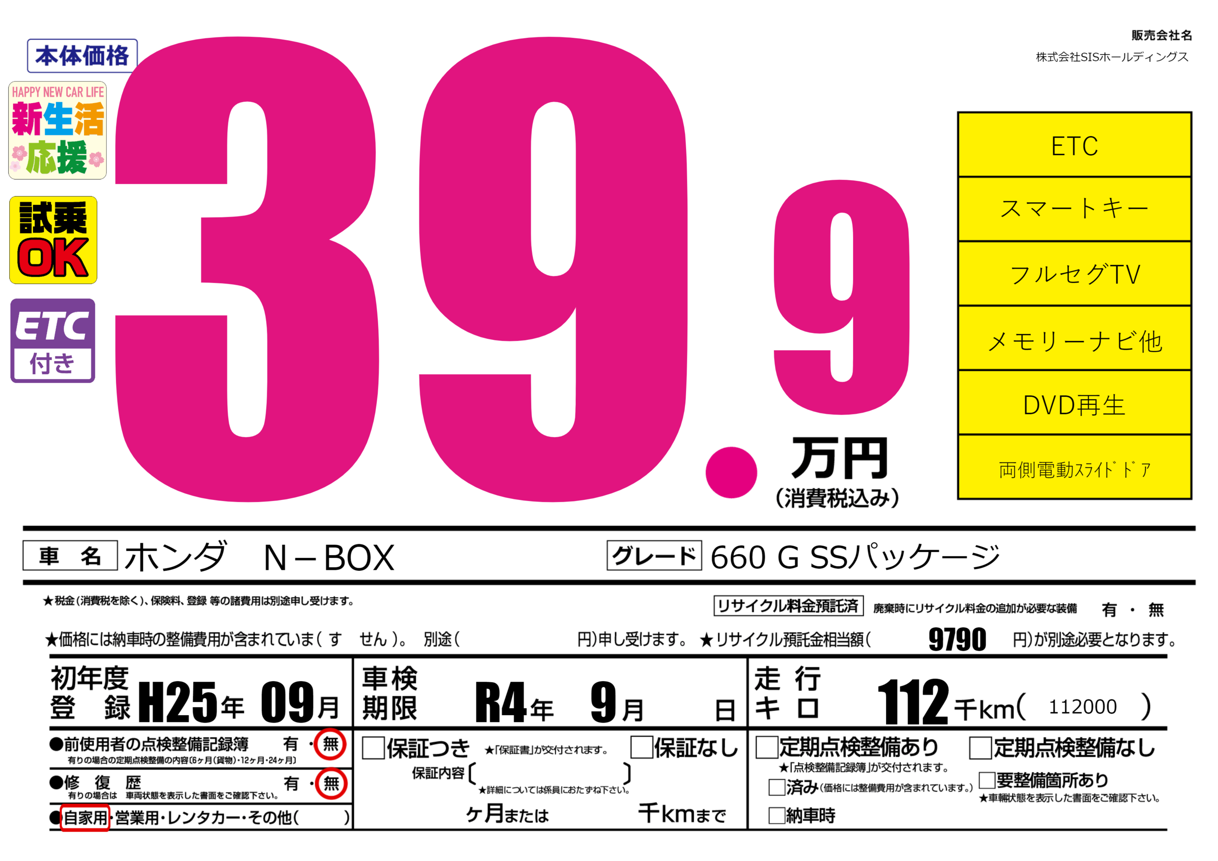 | 車名 | ホンダ N-BOX | グレード ミッション 排気量 |