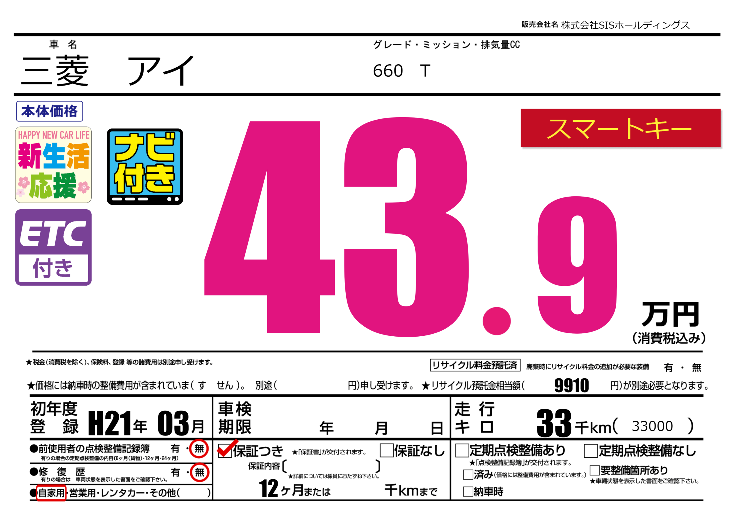 | 車名 | 三菱 アイ | グレード ミッション 排気量 |