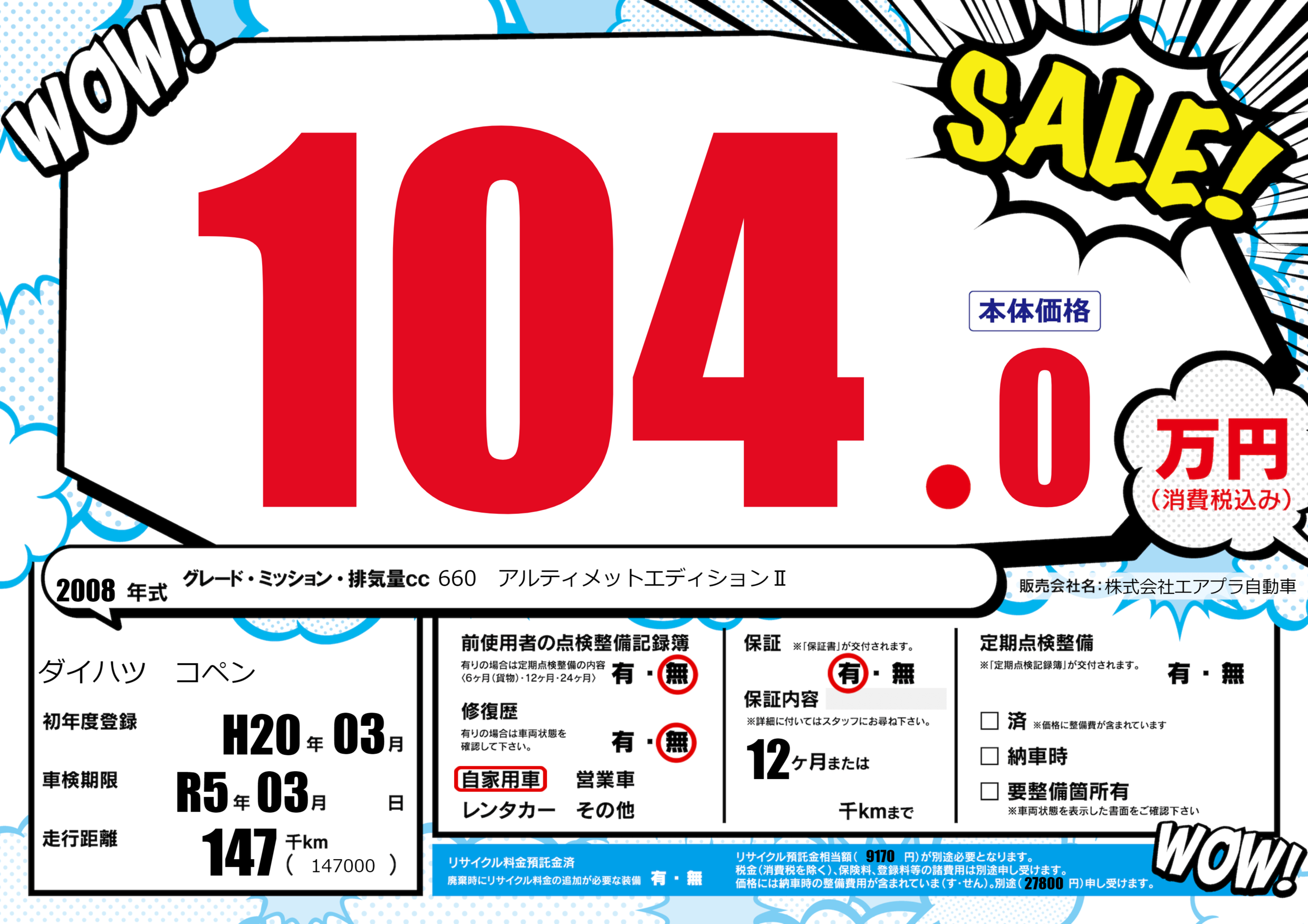 | 車名 | ダイハツ コペン | グレード ミッション 排気量 |