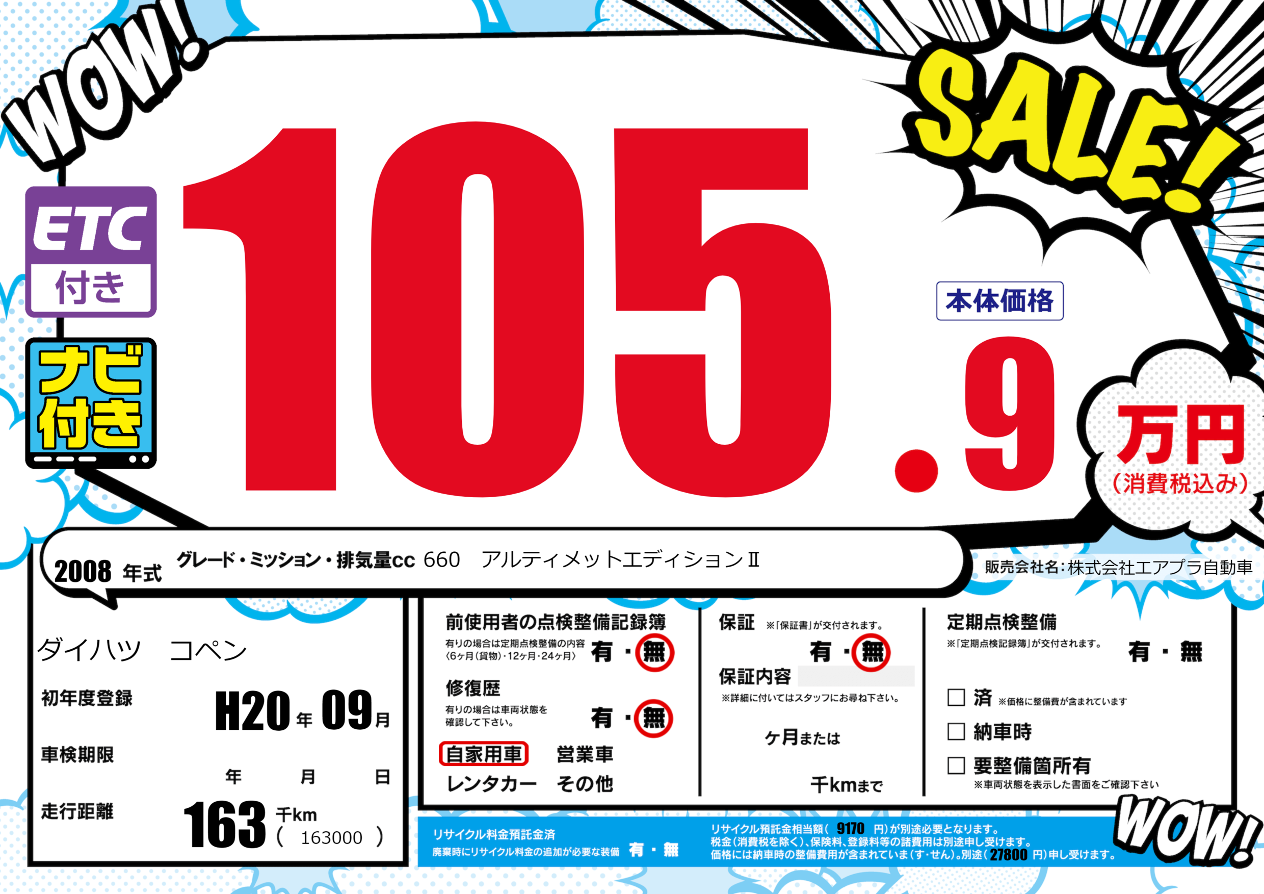 | 車名 | ダイハツ コペン | グレード ミッション 排気量 |