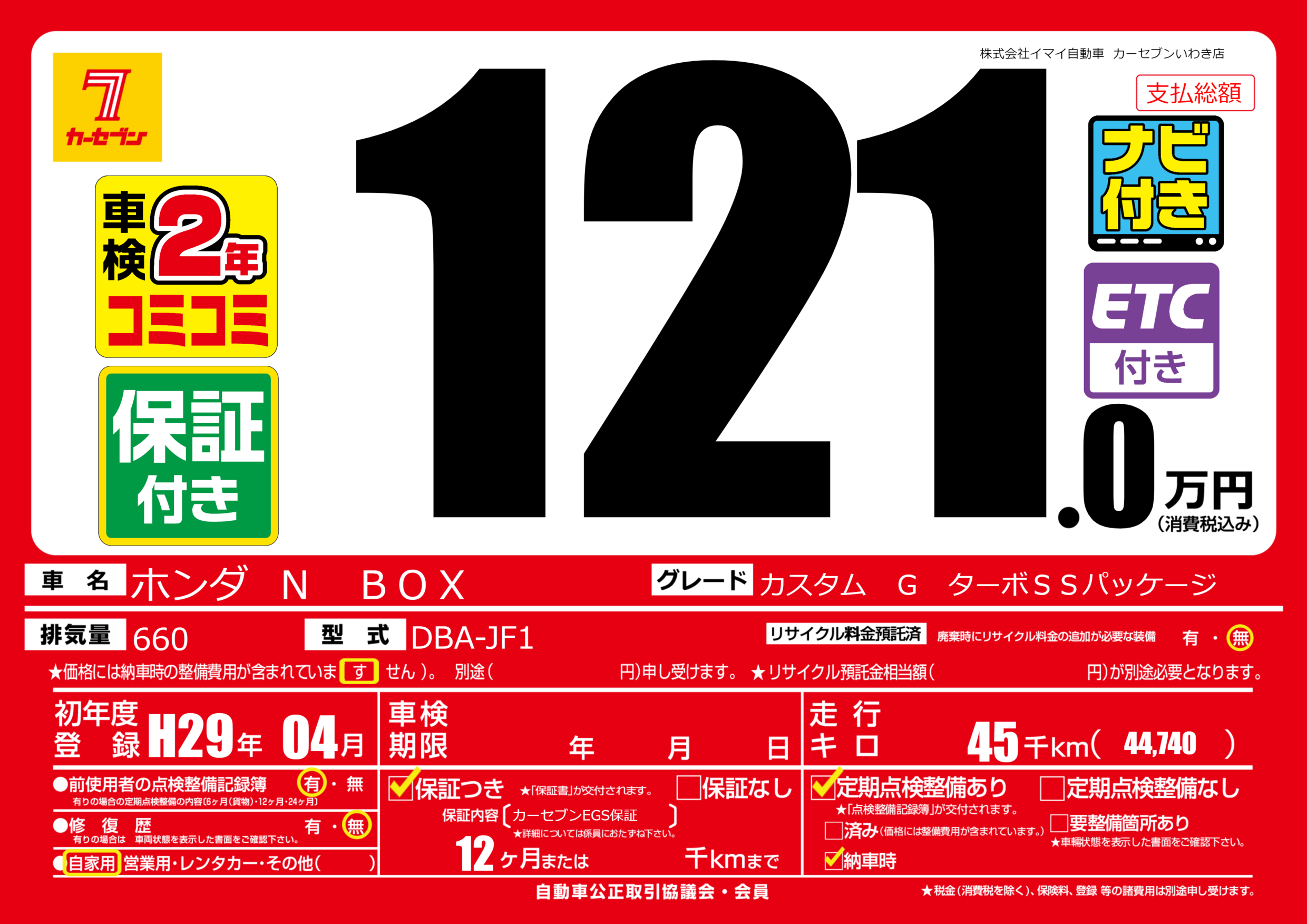 保証付き 保証内容(カーセブンEGS保証) 12ヶ月または千km |