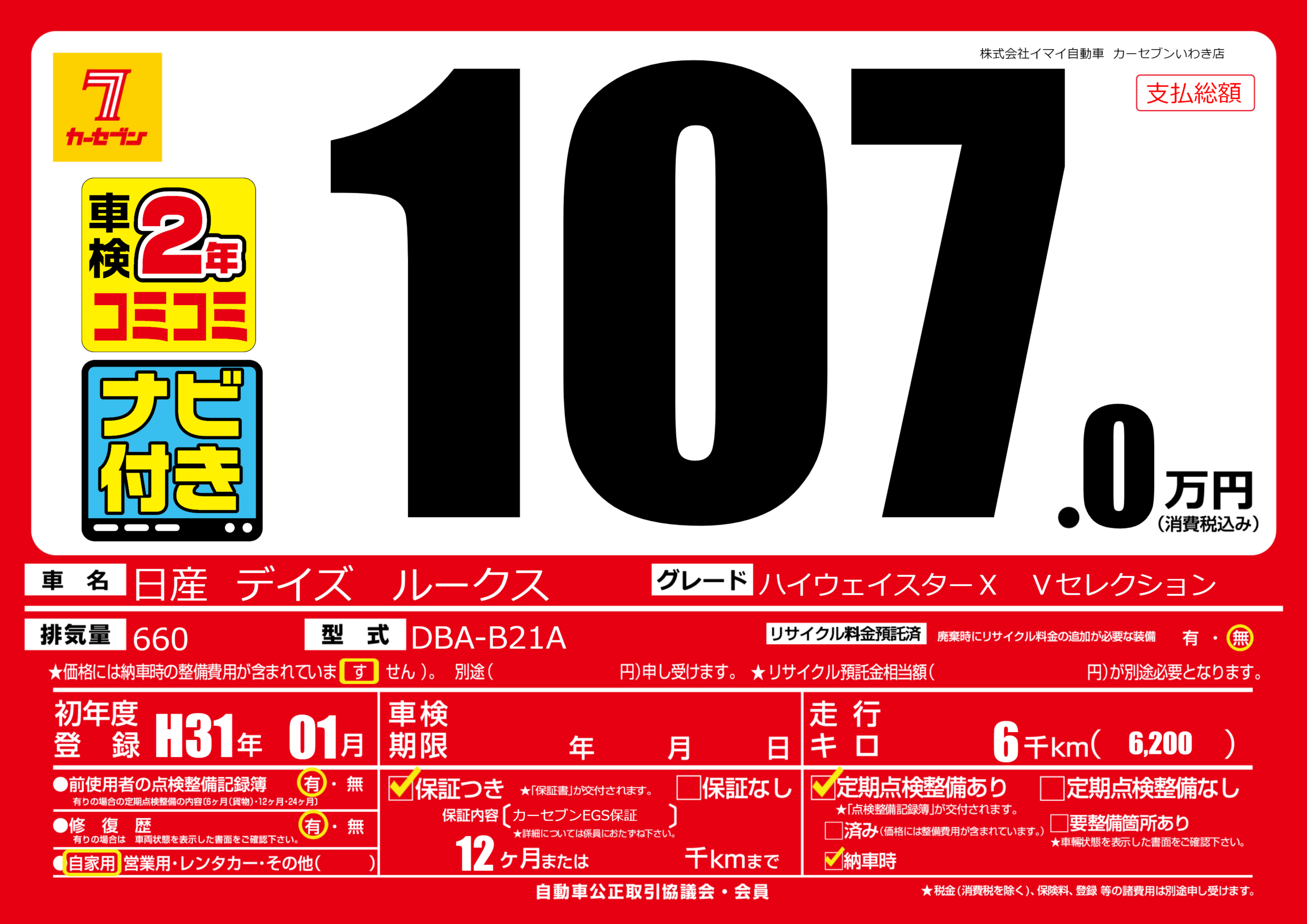 | 定期点検整備 | 定期点検整備あり 納車時あり | ||