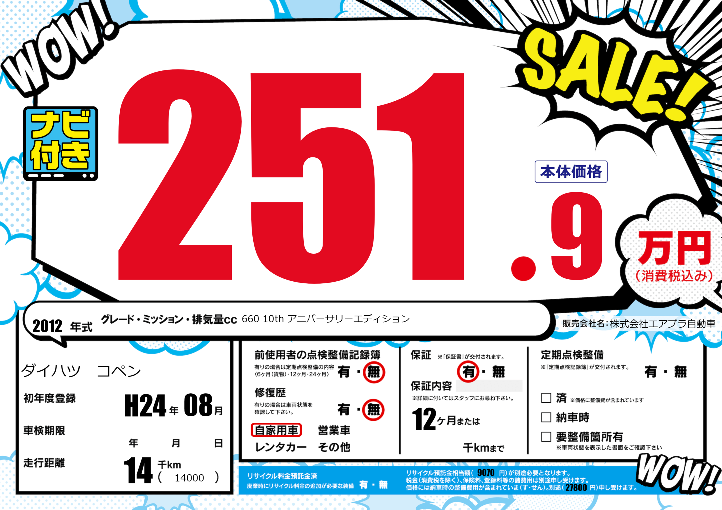 | 車名 | ダイハツ コペン | グレード ミッション 排気量 |