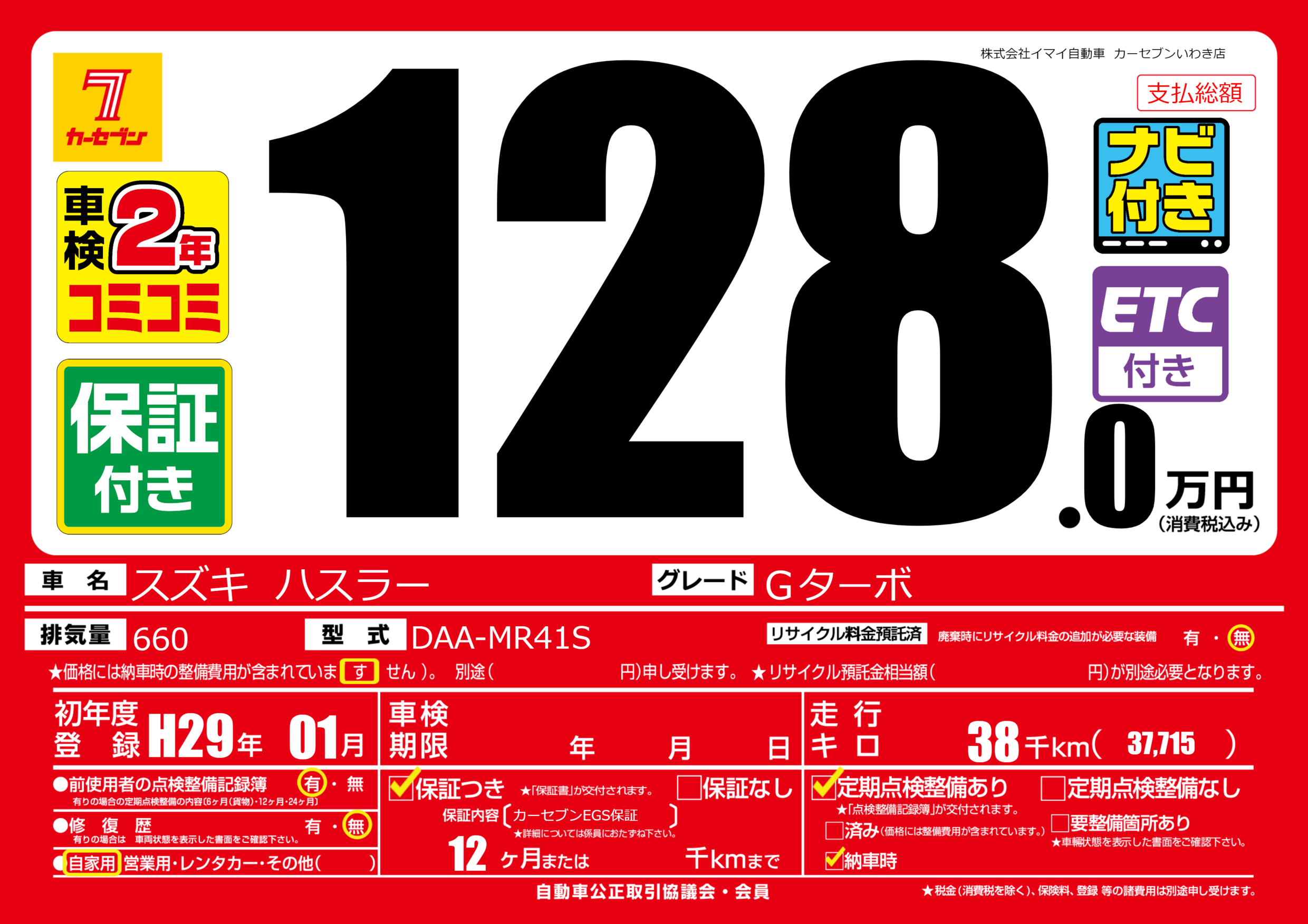 | 走行キロ | 3.8万km | 初年度登録 | H29年01月 |