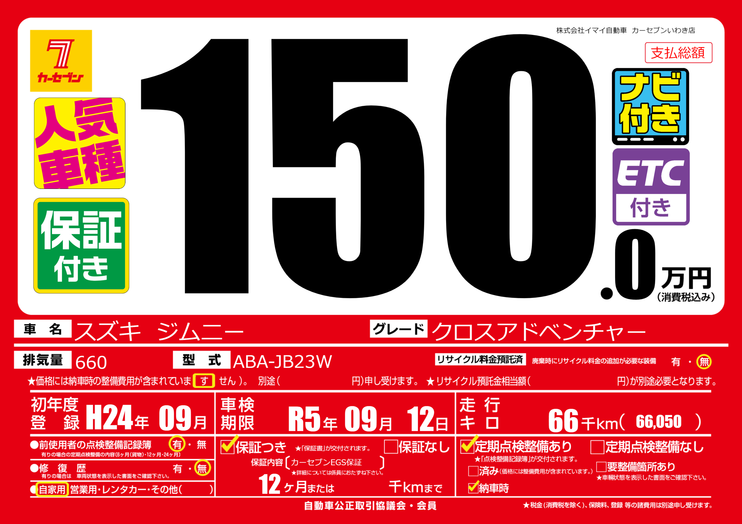 保証付き 保証内容(カーセブンEGS保証) 12ヶ月または千km |