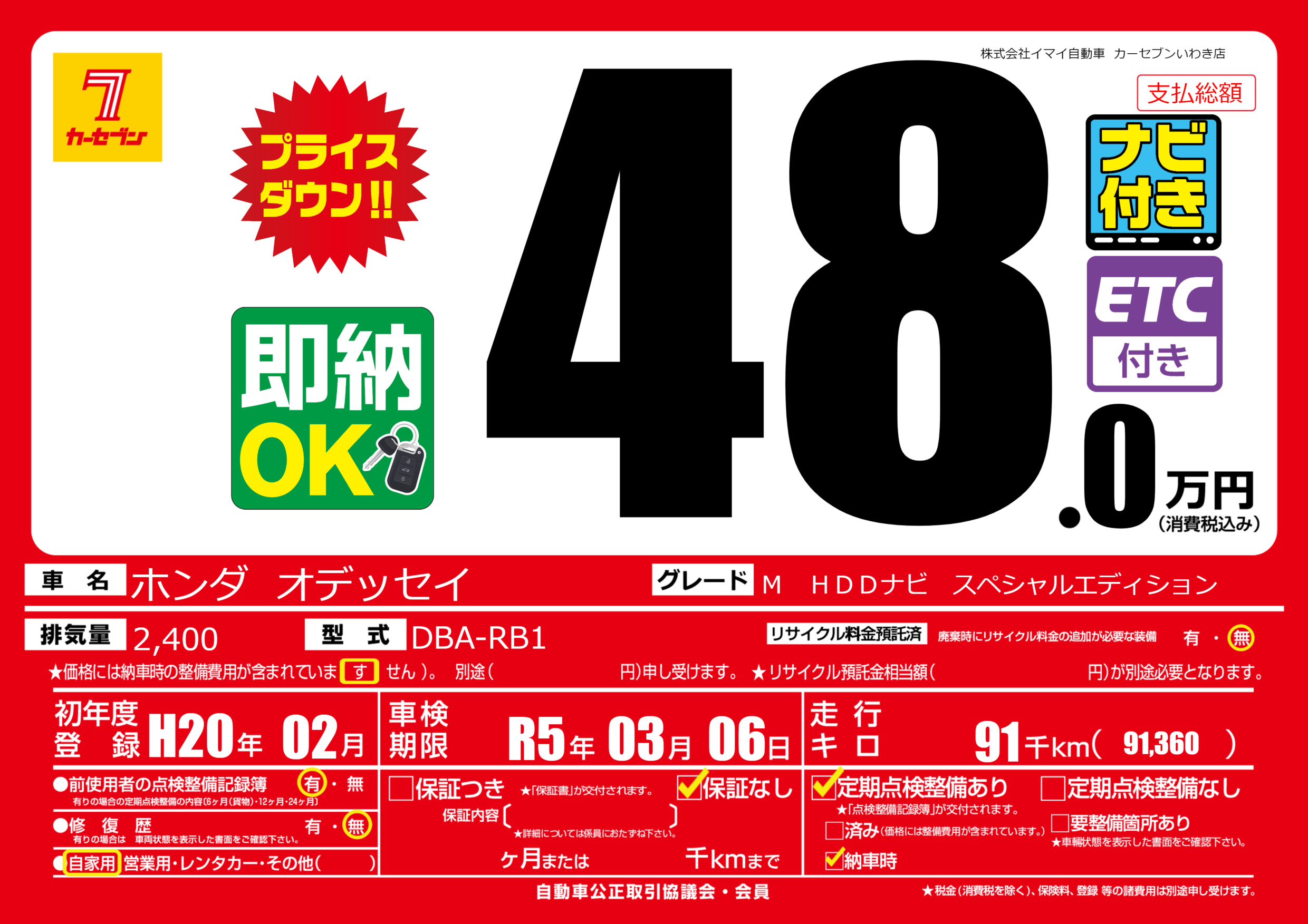 | 走行キロ | 9.1万km | 初年度登録 | H20年02月 |