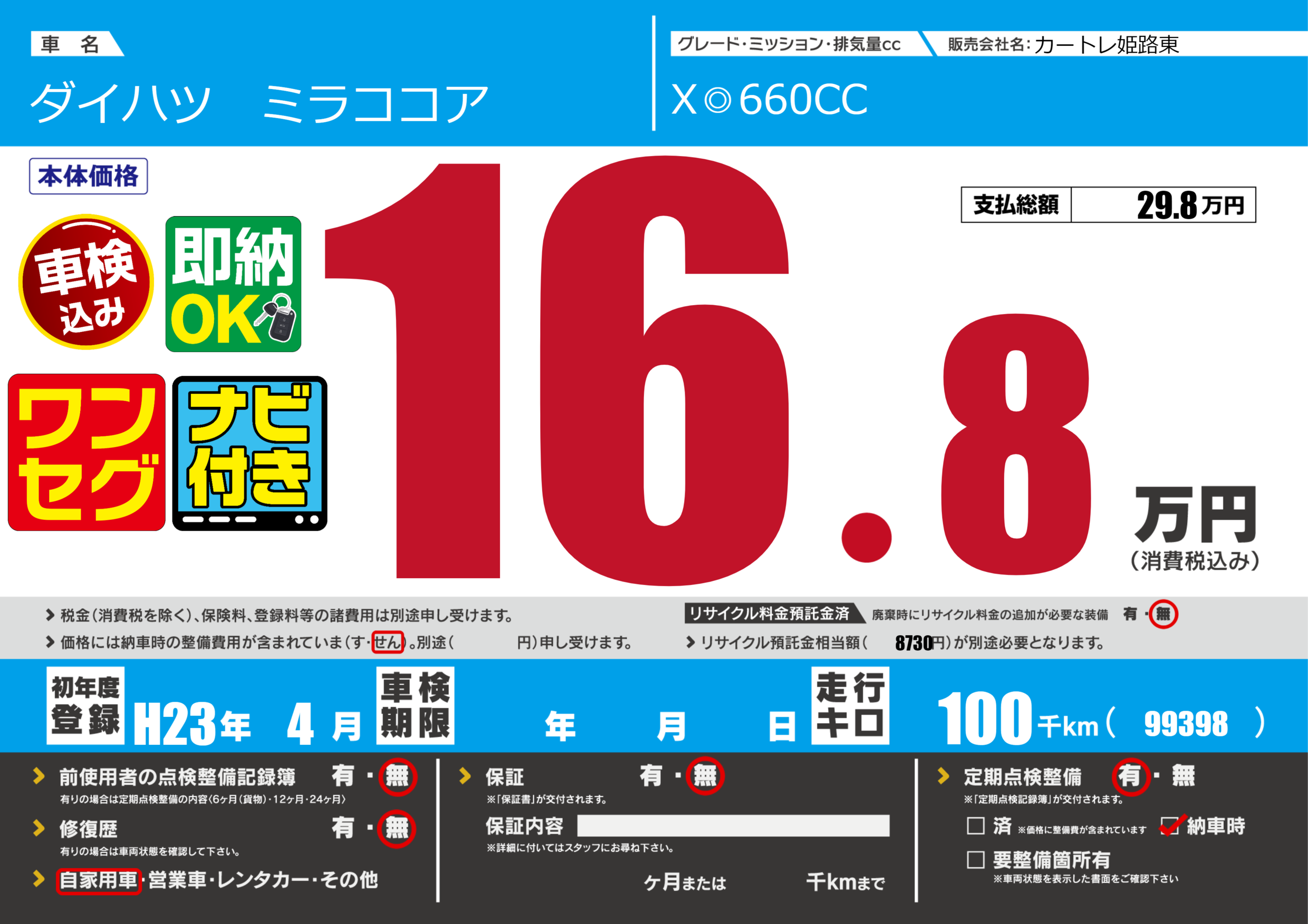 | 定期点検整備 | 定期点検整備あり 納車時あり | ||