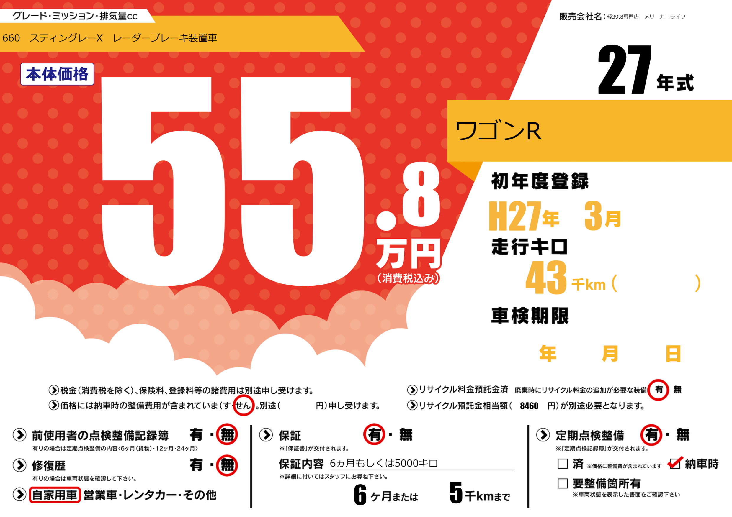 | 車名 | ワゴンR | グレード ミッション 排気量 |