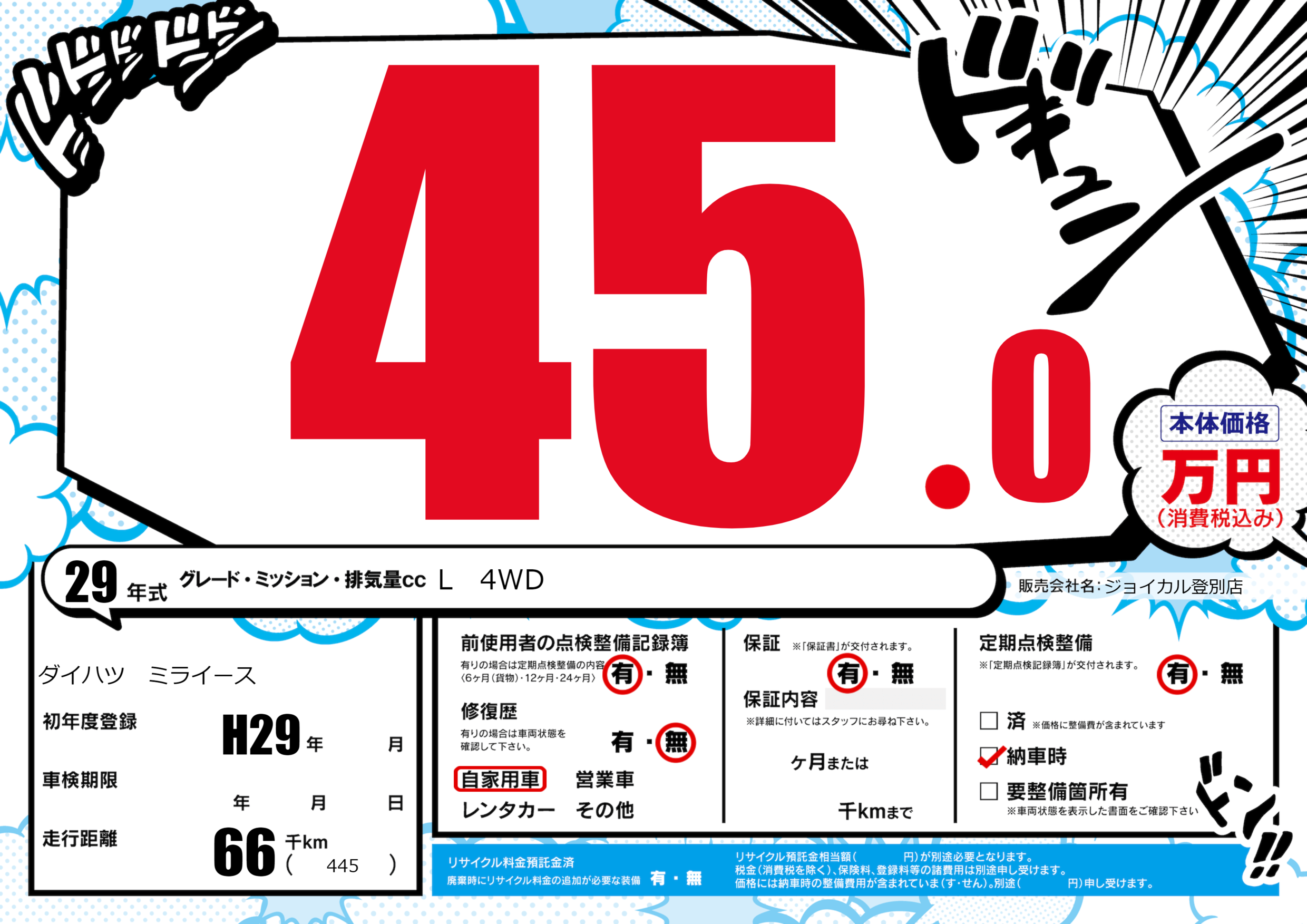 | 走行キロ | 6.6万km | 初年度登録 | H29年---月 |